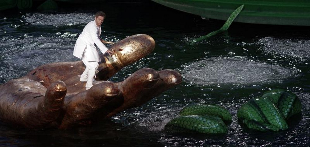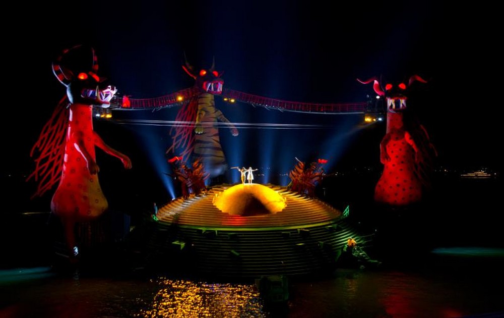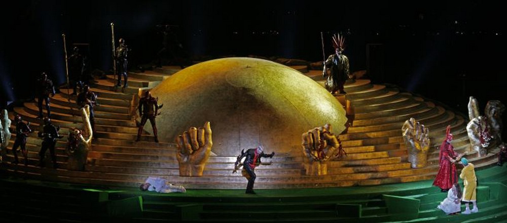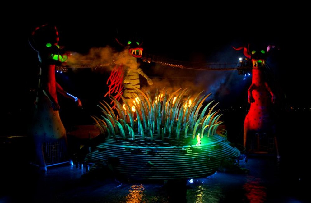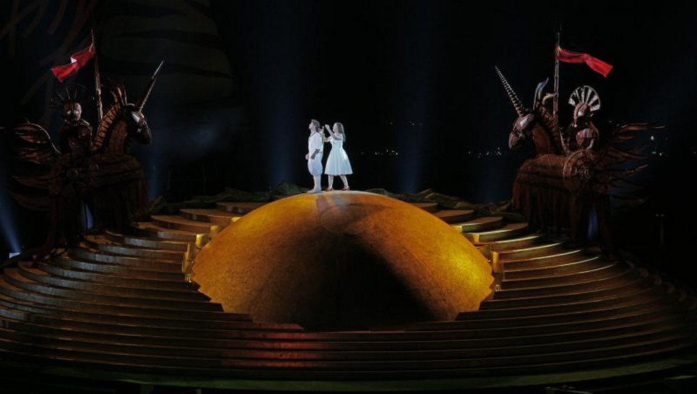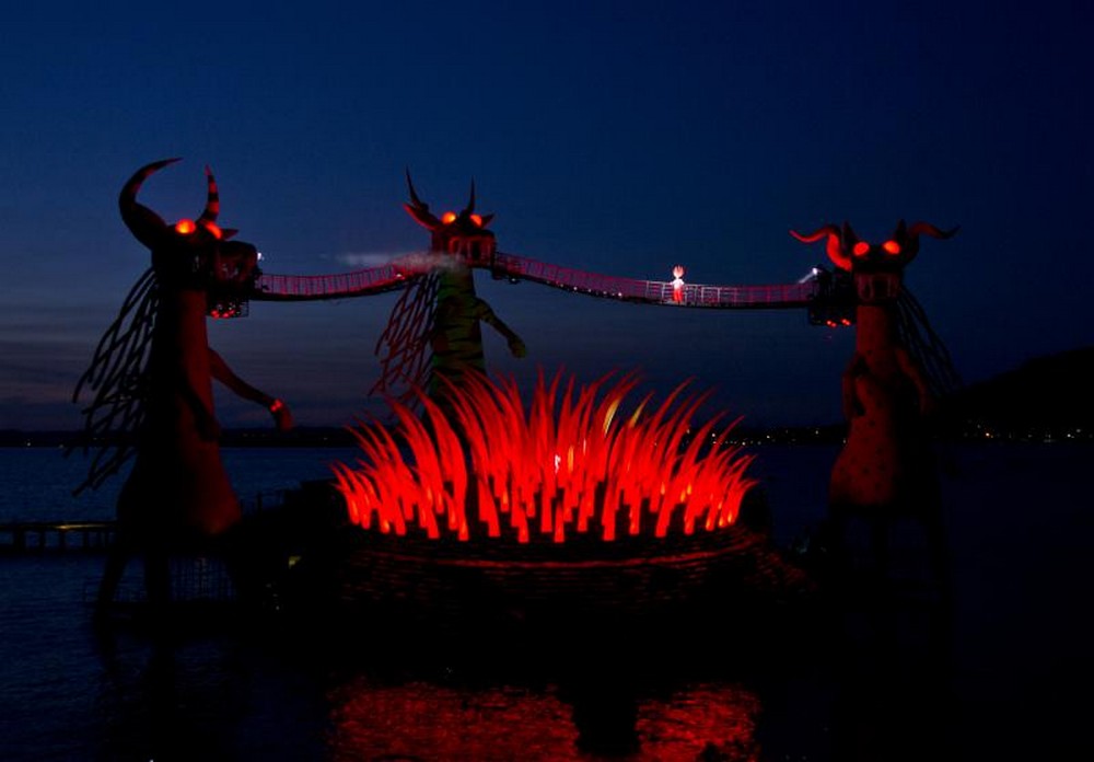 Obří draci tyčící se do výše dvaceti sedmi metrů nad potemnělou hladinou Bodamského jezera naposledy chrlí dým, do noční oblohy letí z pódia poslední ohňostroj, impozantní točna ve tvaru želvího krunýře se ještě jednou otočí a přes vodu přicházejí z jeviště Pamina a Tamino v kostýmech, jejichž výrazným prvkem je duha jako symbol naděje a nové budoucnosti.