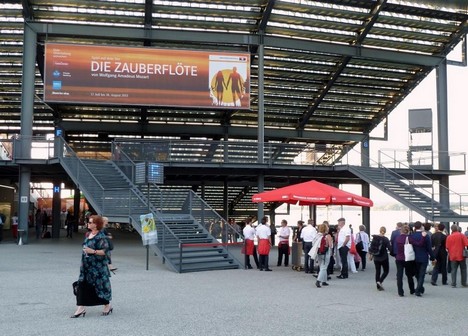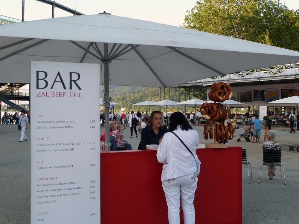 Dobrou organizaci festivalu ocení jistě i všichni návštěvníci. Informační centrum a pokladny poskytují veškeré potřebné informace, propagační tiskoviny včetně festivalových novin a také upomínkové předměty. Před představením je v prodejních stáncích možné koupit kromě programu navíc třeba podsedák či deku ve festivalových barvách, sprej proti komárům v elegantním balení i upomínkovou dřevěnou flétničku. Občerstvení je zajištěno v bohaté šíři nejen před začátkem představení, ale ještě hodinu po jeho skončení, což v případě Kouzelné flétny znamená až do jedné hodiny v noci. V nabídce je speciální menu a mimo jiné i příležitostné koktejly s názvy jako Papageno či Královna noci. Bregenzský festival je zážitek nejen hudební.+++