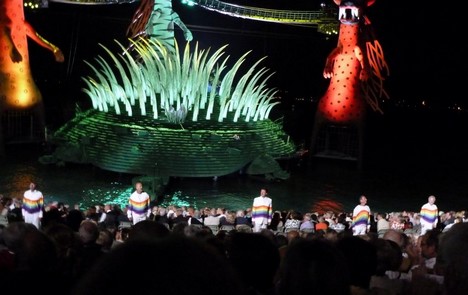 Velice náročná byla pro sbor také práce na opeře Kupec benátský, která byla ve Festivalovém divadle uvedena ve světové premiéře. Její autor, polský skladatel a klavírista André Tchaikowsky (1935–1982), do ní vkomponoval obtížný sborový part, vyžadující opravdu mimořádné technické kvality sboru, s místy sólistickým nároky zejména na ženské hlasy. Sbor pod vedením Lukáše Vasilka věnoval již v Praze velkou pozornost nastudování hudební složky, aby ji měl již před příjezdem do Bregenzu dokonale zažitou a mohl se soustředit na scénické zkoušky. Režisér představení Keith Warner také přišel s propracovanou divadelní koncepcí a s vysokými požadavky na téměř činoherní herectví od sólistů i sboru. Takový přístup sice nebyl překvapivý právě u britského režiséra a opery na námět jedné z velkých Shakespearových tragédií, požadavky, které na účinkující kladl, však byly zcela naplněny pouze díky mimořádnému nasazení všech zúčastněných včetně Pražského filharmonického sboru.+++===Specifikem – a také hlavní atrakcí – Bregenzského festivalu je venkovní scéna na Bodamském jezeře, která je pro každou inscenaci zcela odlišná a je pokaždé znovu speciálně zkonstruována. Vždy je však monumentální a výpravná, a Bregenz se tak může pyšnit tím, že má největší vodní scénu na světě. Jeviště pro letošní inscenaci Kouzelné flétny (jako všechny zdejší hlavní inscenace se bude opakovat podruhé v příštím roce) je postaveno na sto devatenácti pilotech a má úctyhodné rozměry – dlouhé je čtyřicet tři metrů a široké čtyřicet jedna metrů. Složitá konstrukce ze dřeva a oceli má tvar želvy, která je podle scénografa Johana Engelse v řadě mimoevropských mytologií kosmickým symbolem Země či silou na svém krunýři Zemi nesoucí. Výška tohoto konkrétního bregenzského krunýře, který je ve skutečnosti velikým oválným schodištěm, činí téměř deset metrů a jeho vrchní část spočívá na točně, jež má schopnost plynulého otočení o 360 stupňů. Přímo do scény jsou zabudovány desítky reproduktorů, které jsou součástí sofistikovaného systému nazvučení. Ten v reálném čase kombinuje přenos ze sálu Festivalového divadla, kde jsou umístěni dirigent, orchestr a sbor, se zpěvem sólistů na scéně vybavených mikroporty, u nichž se také snaží o zachování prostorové reality zvuku. Pro úspěch každého představení jsou proto důležité nejen umělecké výkony hudebníků, ale i pečlivá práce velkého počtu technického personálu, a významnou roli zde mají také kaskadéři, potápěči, pyrotechnici a statisté.+++