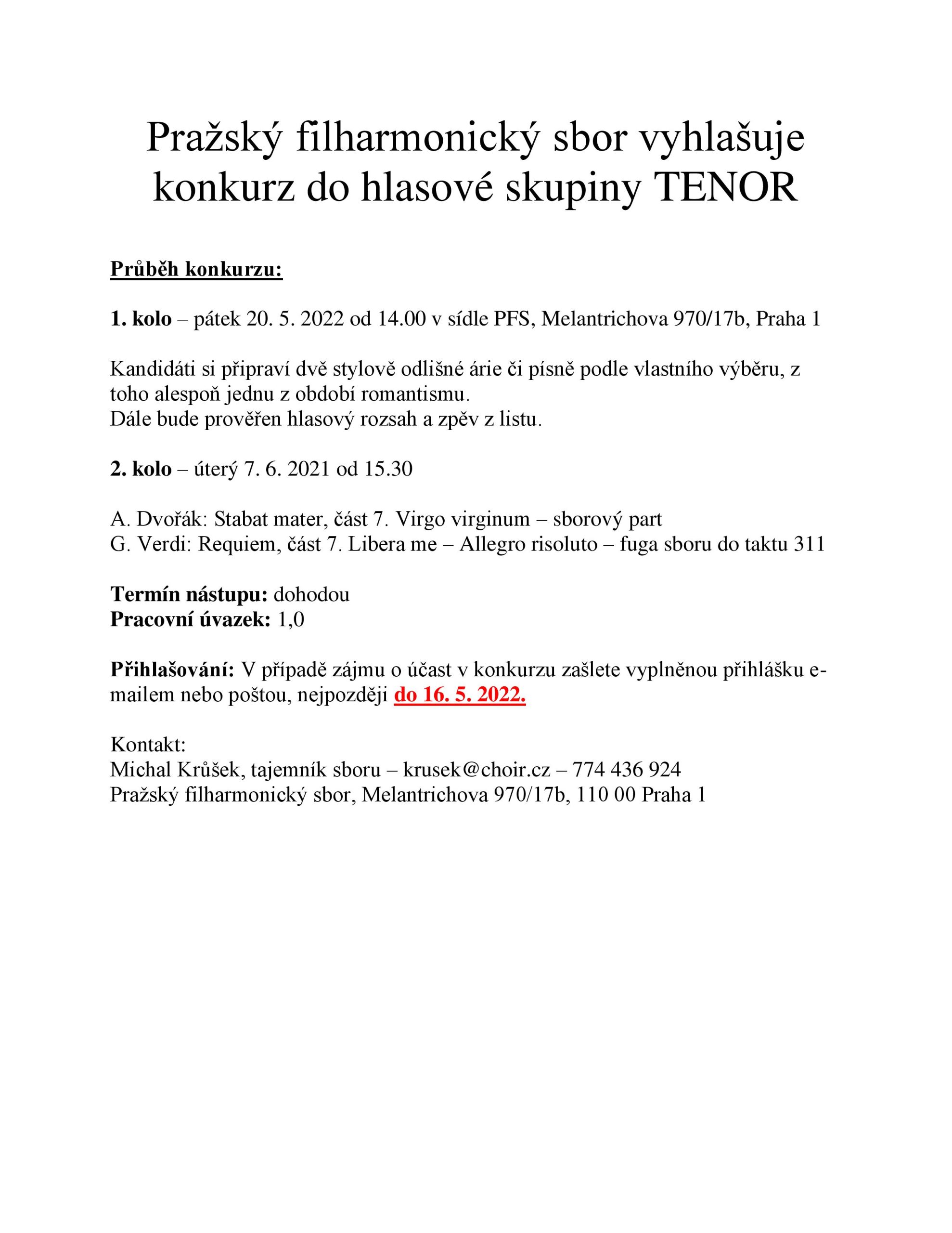 Inzerce Pražský filharmonický sbor vyhlašuje konkurz do hlasové skupiny tenor Publikováno 25/04/2022 sdílejte: 0 minut čtení sdílejte: Informace, přihláška a notový materiál ke stažení zde. TémataSeznam inzerátů Sdílet článek Facebook email zkopíruj odkaz vytisknout sdílejte: Předchozí článek Týden s hudbou. České i zahraniční koncerty, nejzajímavější TV a online přenosy Další článek Collegium Marianum působivě zahájilo jarní cyklus Barokních podvečerů 0 0 hlasy Ohodnoťte článek Odebírat Přihlášení Upozornit na nové a další komentáře nové odpovědi na můj komentář Label {} [+] Jméno* E-mail* Webová stránka Label {} [+] Jméno* E-mail* Webová stránka 0 Komentáře Nejstarší Nejnovější Most Voted Inline Feedbacks Zobrazit všechny komentáře Načíst další