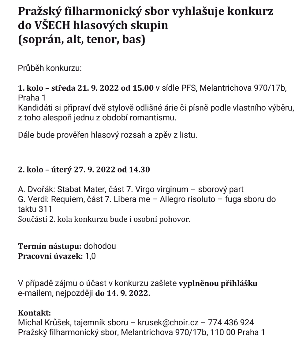 Čtení Pražský filharmonický sbor vyhlašuje konkurz do všech hlasových skupin