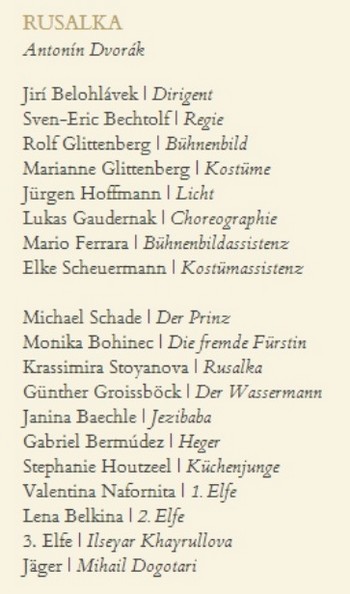 Režie se ujal Němec Sven-Eric Bechtolf, pod hudebním nastudováním je podepsán náš Jiří Bělohlávek, který touto Rusalkou v přestižním vídeňském operním domě debutuje. V titulní roli se představí mimo jiné i ve Vídni velmi oblíbená bulharská sopranistka Krassimira Stoyanova.