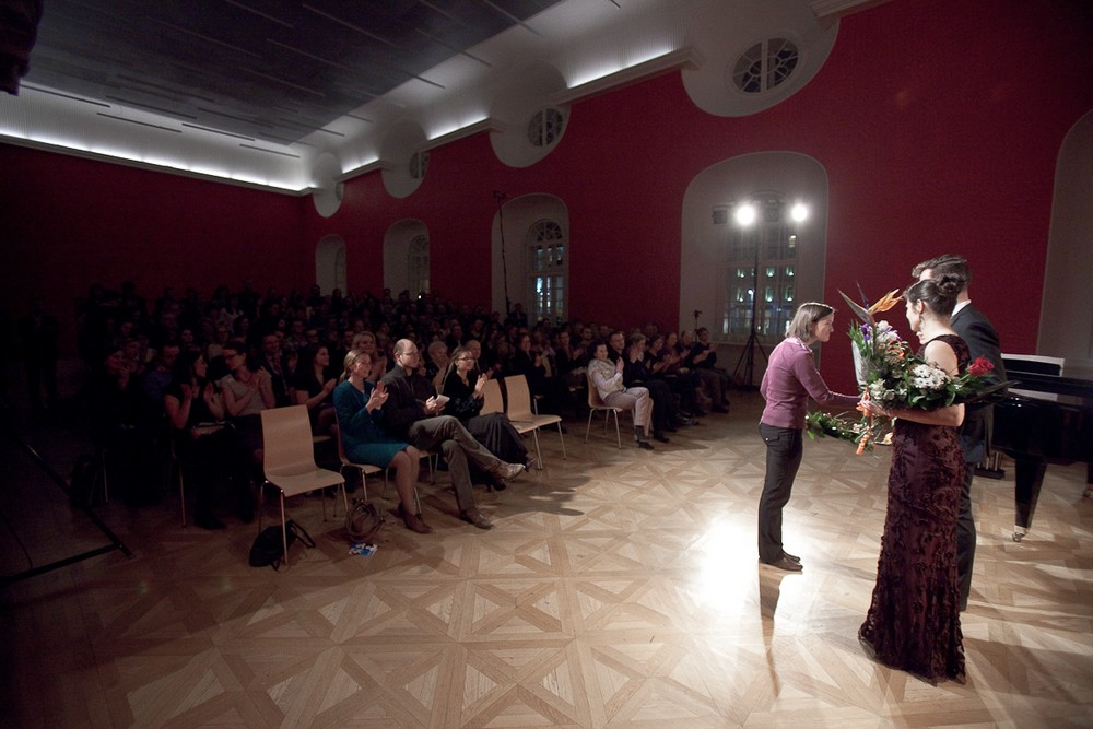 Program totiž bezvadně fungoval na mnoha úrovních. Výborně pokrýval rámec Roku české hudby 2014, do něhož byl středeční večer zasazen, přičemž zároveň volba těchto českých autorů byla silně lákavá jak pro příznivce Opery Diversy jako takové, tak i pro běžného či svátečního návštěvníka koncertů komorní hudby. Což opět není míněno nikterak zle, naopak velmi znatelně se to odrazilo na vysoké účasti, která si vynutila i vytvoření nové židlové řady. Prostor Mozartova sálu byl toho večera ze dvou třetin vyplněn vyvyšujícím se hledištěm, oproti němuž (hledím pro tento večer výjimečně naorientováno směr Masarykova ulice) vznikl intimní prostor pro výše uvedené a níže popsané interprety. Zde si nemohu odpustit poznámku, že jsem s tímto ustavením velmi dlouho bojoval a to zejména po zvukové stránce. Klavíristka Jana Nevoralová tak měla poměrně složitou situaci, nad níž ovšem bez mrknutí postupně zcela zvítězila.