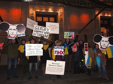 Ruský dirigent Valerij Gergijev je sice ve světě vážné hudby pokládán za jednoho z nejvýznamnější šéfů orchestrů, avšak jeho blízkost k ruskému prezidentovi Vladimiru Putinovi vadí mnoha lidem, a tak je mistrovo nynější turné po Spojených státech provázeno incidenty s odpůrci ruské politiky.Jeden z protestujících ve čtvrtek večer vtrhl na scénu newyorské Metropolitní opery, zrovna když maestro a jeho krajanka, sopranistka Anna Netrebko, rovněž blízká Kremlu, sklízeli ovace za interpretaci Čajkovského opery Jolanta.„Muž mával transparentem ozdobeným ukrajinskou vlajkou a přirovnávajícím Vladimira Putina k Adolfu Hitlerovi, než byl za pískotu publika zatčen,“ popsala protest, odehrávající se přímo na scéně Metropolitní opery, agentura AFP.