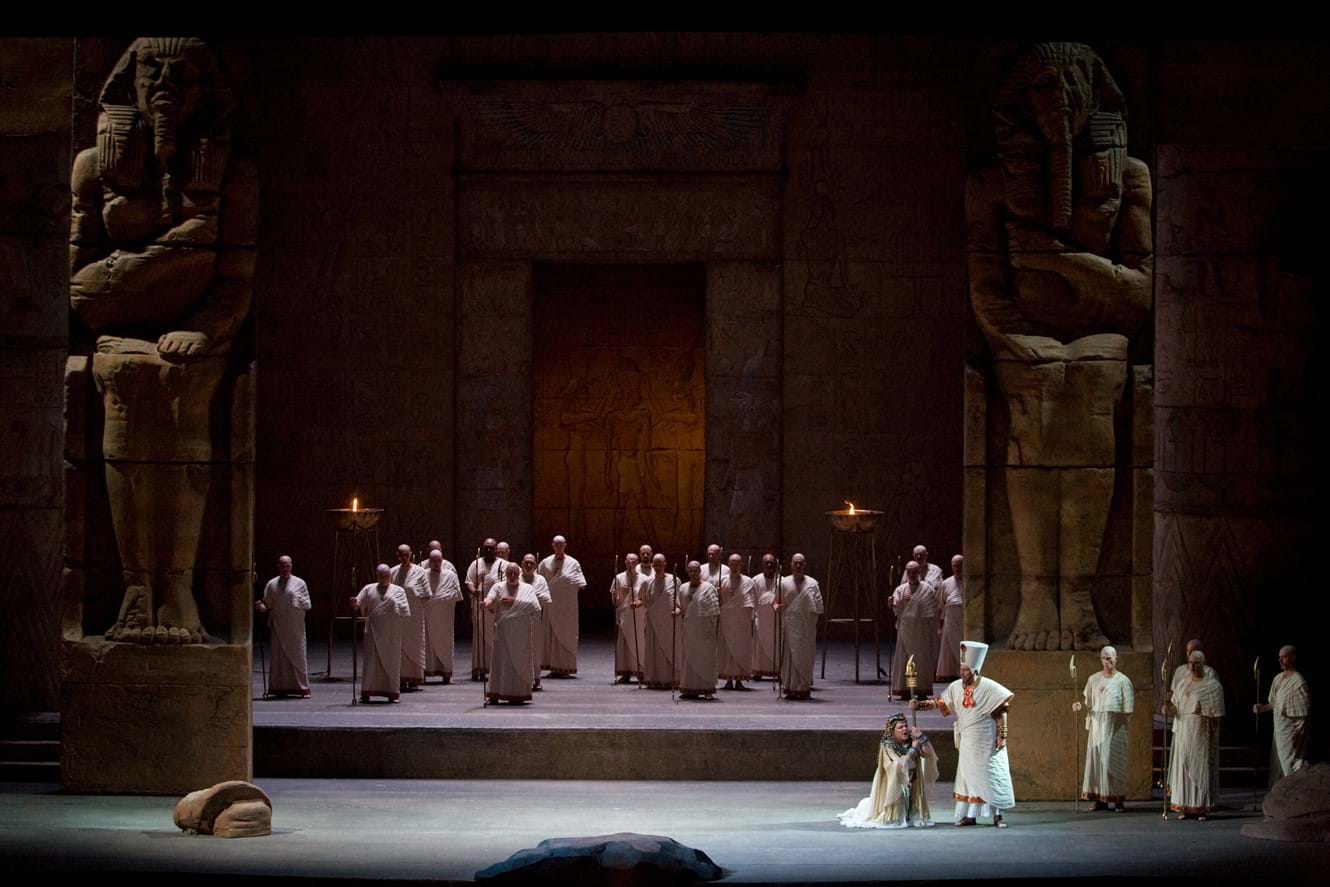 Tady je asi ideální navázat výpravou: z té bylo velmi dobře patrné, jakými zdroji Metropolitan Opera disponuje. Klasické provedení, úžasně impozantní kostýmy, obří kulisy představující starověké chrámy, plné využití jevištní techniky, kdy se v jednu chvíli nezvedaly jen části scény, ale dokonce i úplně celé jeviště (dechberoucí bylo i zahájení Triumfálního pochodu, kdy se plně zalidněná scéna MET objevila za obrovskou chrámovou zdí, na níž stáli egyptští kopiníci a která celá zajela do podlah jeviště – kam se tam vešla absolutně netuším, ale bylo to skvěle šokující a vyvolalo to samostatný potlesk scénografovi a technikům), plné jeviště, ať již díky rozsáhlému sboru, tak i díky obsazení opravdu obrovského počtu statistů. A veliký potlesk také technice, která to v tomto představení určitě nemá lehké a tak tak stíhá přestavby ohromných kulis v jendotlivých pauzách.