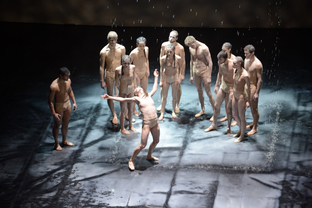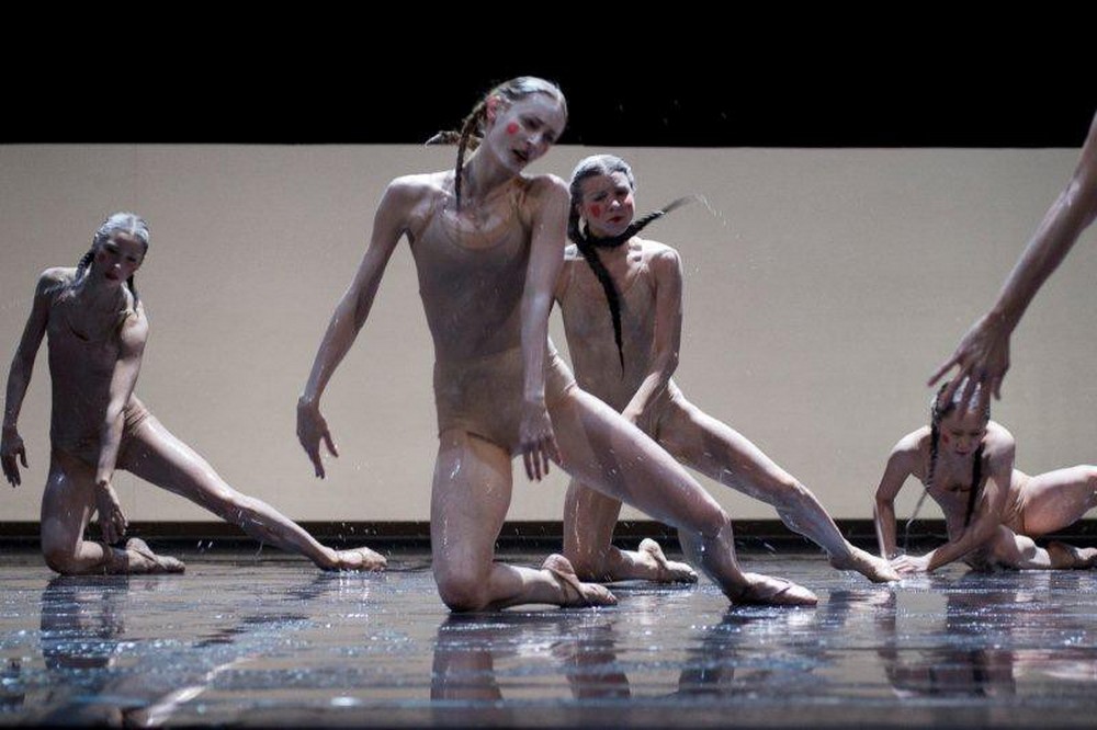 Zlom prichádza v polovici baletu, keď sa zvrchu vyleje na tancujúcich voda, ktorá ich premočí a zatopí javisko. Po úsečnej, geometrickej prvej časti, voda v spojení s baletnou podlahou dáva pohybu novú dimenziu – kĺzanie. Tanečnice v špagáte kĺžu cez celé javisko, akoby ich hnala nejaká tajná sila. Choreograf nestavia na prvoplánovom motíve tancovať vo vode, ale v tom, čo voda prináša. Voda ako symbol očisty, voda ako symbol života, voda, ktorá zavlaží vyschnuté zemité telá tanečníkov. V tejto vode sa odohráva druhá časť, kedy celkom nevdojak je zo šiestich žien vybraná jedna, ktorá sa stáva sólistkou. Či sa stáva aj onou jarnou obeťou bohom je nejasné. Ak iné inscenácie sprevádza silné fyzické tancovanie a nasadenie v rytme hudby, Clug ide skôr kontrapunkticky proti. Celá druhá polovica vedie k očisťujúcemu záveru kedy na zbor, možno vplyvom modlitieb, či obety začína pršať. Túžba po vode, čo znovu zrodí, je vyslyšaná.