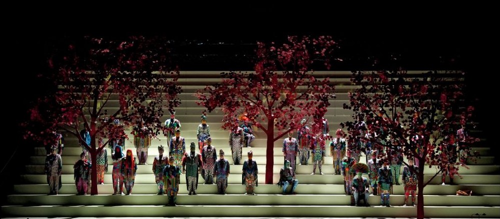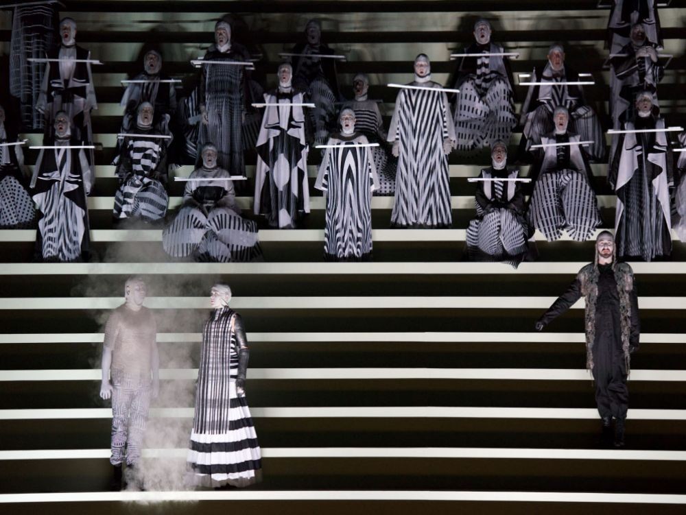 S farebnosťou nespútaného a temperamentného života kočovných Cigánov kontrastuje bieločierny chlad Pekla. Všetky farby vymizli, zostáva len svetlo a tma, tiene vo vetre. Libreto, zdôrazňujúce vnútornú psychológiu hlavných postáv s odklonom od tradičných dramatických akcií, interpretuje réžia ako operu-obraz. V hornej časti schodiska umiestnený temer nehybný zbor – duše, nižšie traja protagonisti a vo vzduchu zavesená čierna a biela nespievajúca postava Danteho a Vergília (ich party obstarávajú sólisti, ukrytí v zadných radoch orchestra). Tragédiu milostného trojuholníka vypravuje len previevajúci vzdušný vír – contrapasso, napodobňujúce turbulenciu zhubných vášní, ktorým duše v tomto kruhu Pekla podľahli – a detailne premyslené kĺzavé pohyby Francesky a Paola.