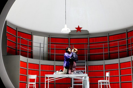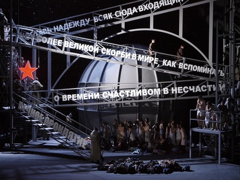 Scénograficky jsou obě aktovky propojeny konstrukcí (scéna Benoît Dugardyn), která velmi silně připomíná řešení použité pro uvedení Schönbergova Jakubova žebříku a Pucciniho aktovky Gianni Schicchi z roku 2000 v režii Marca Artura Marelliho. Po Jakubově žebříku tehdy stoupaly k vykoupení duše, nesoucí si v kufrech zbytky své pozemskosti, které cestou odhazovaly, a v Pucciniho satiře se stal obrovský kufr místem, kde příbuzní čekají, až Gianni natáhne bačkory a oni si budou moci poprat o to, co po něm hmotného zbylo. Jakkoli se tehdy jednalo dvě naprosto odlišná, v podstatě nesourodá díla, režijní a výtvarný nápad z nich učinil dvě strany téže mince. Jenže když dva dělají totéž, není to vždy totéž.V Jolantě je na scéně jakýsi kosmický modul, sputnik (podle ilustrace v programu to ale také může být skleněná koule s uzavřeným světem uvnitř), zkrátka hermeticky uzavřený prostor, v němž je držena slepá Jolanta; po obvodu pláště je v azbuce varovný nápis zákazu vstupu pro nezvané.  Otočením „sputnika“ se objeví jeho vnitřek s jakousi vestavěnou kapličkou či zámečkem (podle originálu se má první scéna odehrávat v zahradě), v ostrém světle vzorně seřazené „ošetřovatelky“ s bílými kyticemi a ptačími klecemi čekají na Jolantu. Už tady se objeví několik zbytečností, jedna z družek například pásmem přeměřuje prostor, do nějž má Jolanta vstoupit, aby židle stála na přesně daném místě (Jolantiny pohyby mají přesně danou trasu), vévoda a hrabě přijíždějí na lyžích oblečení jako polární badatelé (!), a především je naprosto zbytečný až trapný přimyšlený taneční výstup Matyldy  při vévodově vzpomínce na ni. Ale všechno by bylo celkem přijatelné až do chvíle, kdy vstoupí král, který podle kostýmu jako by si právě odskočil z velké vlastenecké války (kostýmy Jorge Jara). A když pak na konci do velkého hymnu na světlo a lásku náhle zazní výstřely, světlo zhasne, na konstrukci skryté za „sputnikem“ se objeví vojáci s puškami ve známých dlouhých pláštích a helmách se špicí a shůry se snese rudá pěticípá hvězda, unikne lecjaký povzdech; divačka vedle mne zprava pronesla „no to snad ne“, za mnou se ozvalo něco „už zase – a proč?“. Na ono „proč“ měl ovšem režisér odpověď, protože Rachmaninova Francesca da Rimini nás zavede do gulagu. Konstrukce lomeného schodiště, skrytá na točně za „sputnikem“, se dostane do popředí. I na něm je nápis azbukou, citát z Danteho, že „není větší bída, než vzpomínat v neštěstí na šťastné chvíle“. Duše proklatých jsou vězňové, pohánění rozmnoženým počtem vojáků ze závěru Jolanty. Vojenští úředníci vyhotovují zatykače s rudou hvězdou. Malatesta je paralytický diktátor stalinského typu, vyzývající k boji se stranickým nepřítelem – kterému „kupodivu“ říká Ghibellinové. Francesca se setkává s Paolem ve stranické klubovně (v tu se v této části proměnil vnitřek „sputniku“). Klubovna je obložená od země ke stropu literaturou v rudé plátěné vazbě. „Big brother“ ví, co dělá, protože v lampě spuštěné se stropu je štěnice a milostný rozhovor Francesky a Paola je nahráván na magnetofony. Naříkající duše v závěru, zahaleny mlhou (i obligátní pyrotechnika si přijde na své) vláčí nezbytné kufry; možná by divadla mohla trochu ušetřit finance i místo v rekvizitárnách, kdyby se vytvořila jakási „světová kufrocentrála“ a pro jednotlivé inscenace by se kufry půjčovaly.Podotýkám, že v zásadě nejsem proti aktualizacím, nevadí mi soudobé kostýmy ani časové posuny. Často odkryjí podobné postupy v díle další myšlenkovou rovinu, vytvoří novou estetickou hodnotu. Zde se však jednalo o jakési zbytečné sebemrskačské předvádění sovětské minulosti, našroubované na příběhy, jejichž idea je úplně jinde. Ještě že po hudební stránce předvedl Symfonický orchestr ORF za řízení Vasilije Sinajského dobrý výkon. Kulhající nástupy dechů na začátku Jolanty budiž odpuštěny, Čajkovskij jim to nijak neulehčil. Oporou obou aktovek jsou výkony Olgy Mykytenko (Jolanta a Francesca) a Saimira Pirgu (hrabě Vaudémont a Paolo). Olze Mykytenko se v první aktovce podařilo postihnout proměnu od naivní, nic netušící Jolanty v ženu, odhodlanou vybojovat si svou lásku, ve druhé od pasivní, chladné manželky nemilovaného muže ve vášnivou milenku. Role hraběte Vaudémont a Paola takovou možnost herecké psychologizace nenabízejí, jsou především pěvecky náročné a Saimir Pirgu ve zpěvu nepolevil, Paolovu vášeň se mu podařilo ještě vygradovat a svým způsobem tak Rachmaninova aktovka stála na něm. V Jolantě byl vynikající maurský lékař v podání Elchina Azizova, v jeho případě se také jednalo o vzácnou shodu mezi herecko-pěveckým výkonem i zjevem. Představitelem rolí krále Reného (Jolanta) a Lanceotta Malatesty (Francesca da Rimini) byl Dmitrij Běloselskij, typický basbaryton ruského školení „sempre forte“, jímž se stěží vytvoří věrohodná figura. Při jeho „státnickém“ monologu ve Francesce da Rimini, kdy lká nad tím, že ho jeho žena nikdy nemilovala, jsem si nemohla nevzpomenout, jak podobné doznání dokázal zhudebnit Verdi. Sympatický byl výkon Dalibora Jenise jako šlechetného vévody Roberta v Jolantě, půvabná Barbora Kohoutková si však jistě zaslouží lepší příležitosti, než jako vévodova „vize“ Matylda. Našemu Ladislavu Elgrovi byly přiděleny epizodní role (zbrojnoš Alméric v Jolantě a Dante ve Francesce da Rimini), na nichž nemohly příliš předvést. Vynikající byl jako vždy Schönbergův sbor.