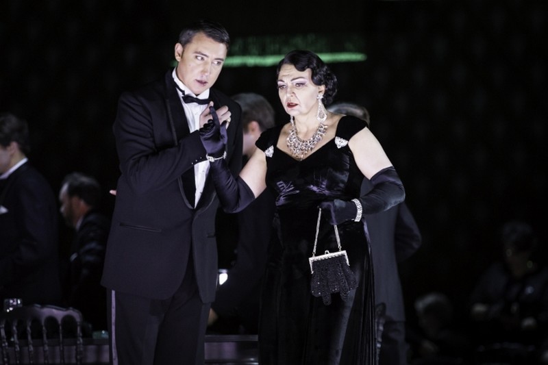 Kasíno naplní smotánka. Popri sebavedomých pánoch a elegantných dámach vyzerá Hermann v sivom baloniaku ako „chyba v Matrixe“. A spoločnosť k nemu tak aj pristupuje: s výnimkou posmešného Tomského (málo farebný barytón Romana Ialcica) ho všetci ignorujú, akoby tam ani nebol. Uzavretý svet funguje sám pre seba, pochybní outsideri tu nie sú vítaní. Pohybu na javisku je málo, strohé gestá podčiarkujú chlad elitnej society. Detský zbor bol škrtnutý: deti do odľudšteného prostredia nepatria – ak aj nejaké existujú, zrejme ostali doma s vychovávateľkami. Hermannova ária Я имени ее не знаю, v ktorej sa pred Tomským vyznáva z lásky k neznámej dievčine, pôsobí v studenom zelenom šerosvite ako zúfalý výkrik.