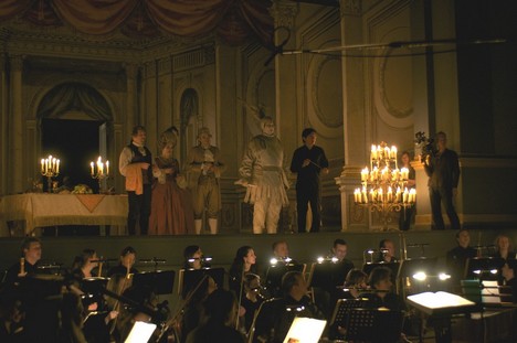 To, co lze spatřit při vstupu dovnitř, překonává všechna očekávání. Uprostřed rozlehlého interiéru a pod obřími nápisy, které zakazovaly kouřit už Oldřichu Novému a Vlastovi Burianovi, stojí pódium. Na něm kulisy a rekvizity evokující závěrečnou scénu z Mozartovy „opery oper“. Salón v klasicistním stylu s nezbytnými zadními dveřmi pro příchod Komtura, stůl prostřený pro prostopášníkovo hodování, dva obrovské svícny po obou stranách jeviště, jehož boční stěny neomylně evokují architektonické prvky Stavovského divadla. Zkrátka, divadlo „jen jako“, ale kupodivu se skutečným orchestrem a dirigentem, který rozhodně nezkouší „jen jako“, ale doopravdy. A protože tím orchestrem je renomované Collegium 1704 a dirigentem nikdo menší než Václav Luks, je na čase ptát se, co že se tu vlastně chystá.