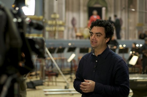 Opět bychom tedy překáželi, ale za několik minut se začne natáčet pasáž, u které už přihlížet smíme. Před ateliérem chystají pyrotechnici zařízení, na němž se bude demonstrovat, k jakým koncům mohlo vést neopatrné používání ohňových efektů v divadlech v osmnáctém století. Systém, který nedovedu popsat jinak než jako hadice vedoucí od plynových bomb k improvizovanému svícnu, je skutečně brzy připraven. Mohu tak brzy sledovat Rolanda Villazóna, jak klade ve věci požárů v divadlech všetečné otázky sympatickému odborníkovi Christopheru Baughovi, emeritnímu profesorovi University of Leeds. Důkazem profesorových tvrzení jsou děsivé plameny, které občas ze svícnu vyšlehnou. Protože se v jinak liduprázdných studiích opodál náhle objeví hlučný kamion, je třeba natáčení na chvíli přerušit. V mezičase udílí režisér Guy Evans Villazónovi instrukce, jak si představuje jeho moderátorský vklad. Patrně cosi důležitého ve smyslu, že by se měl více vcítit do role. „Stanislavsky, Stanislavsky,“ přisvědčuje pěvec vesele a vzápětí může být ohnivá show před atelierem č. 4 dokončena.