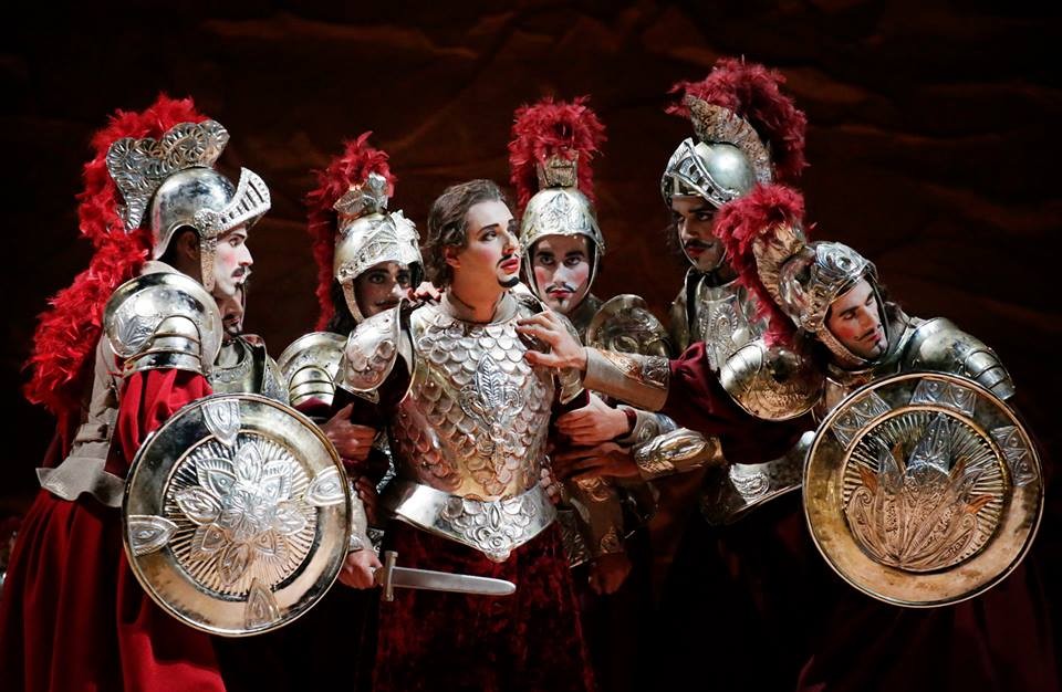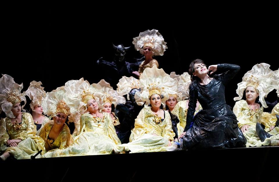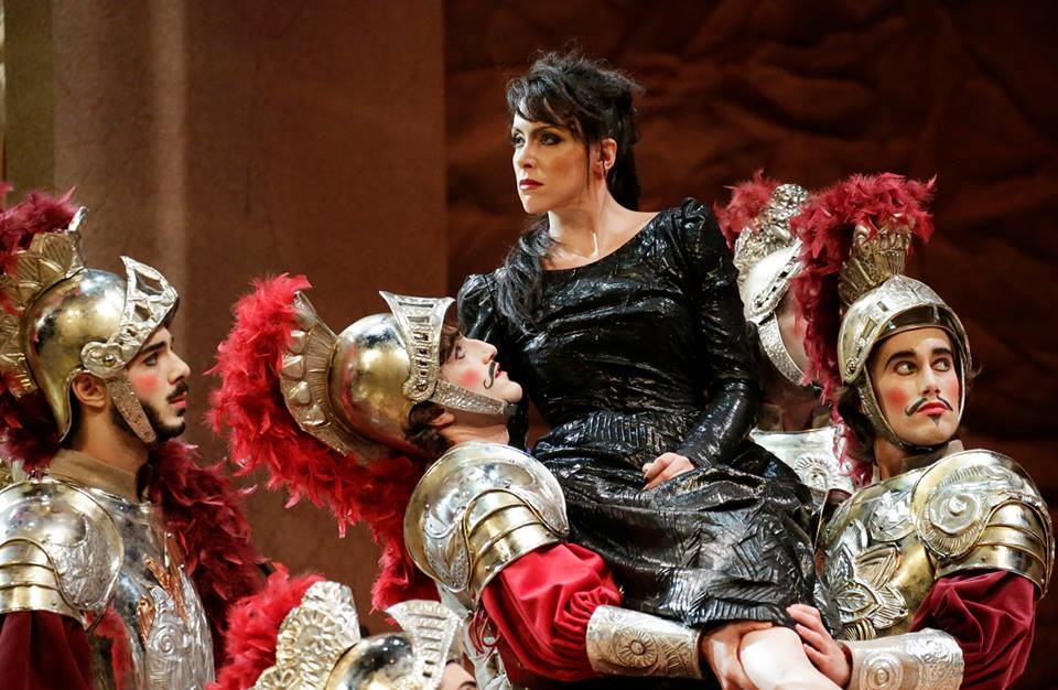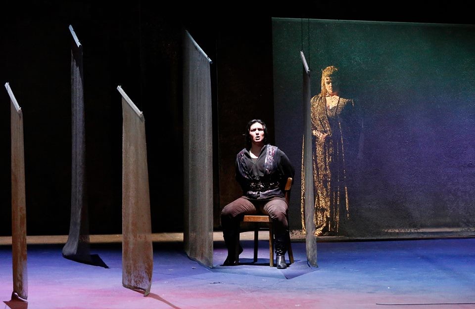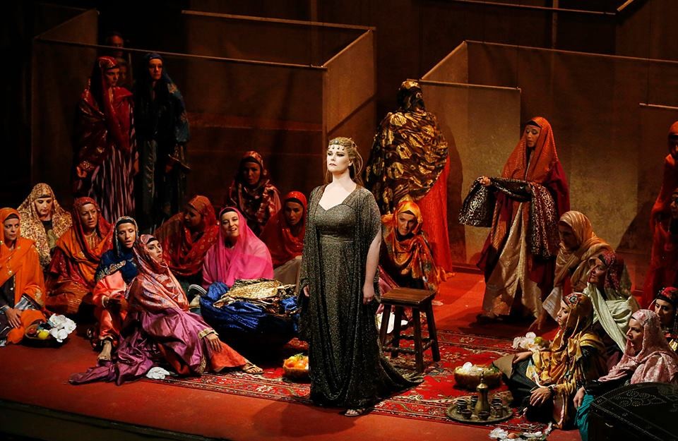 Režisér Mario Martone, scénograf Sergio Tramonti a kostýmová výtvarníčka Ursula Patzak javisko Teatra Rossiniho zbytočne nezahusťovali a vzdušne priehľadnými závojovými stenami menili hrací labyrint. Exotickosť námetu podčiarkovali farebné, historizujúce kostýmy a pastelovo kolorované svietenie. Rozhorané a vysvietené bolo aj proscénium. Vzhľadom na veľkú náročnosť hlavných postáv nevyžadoval režisér žiadne rozptyľujúce herecké akcie, podobne aj zborové výjavy boli poňaté skôr koncertne. Azda najväčším vzruchom bola pastierska scéna so stádom živých (a poslušných) kôz.