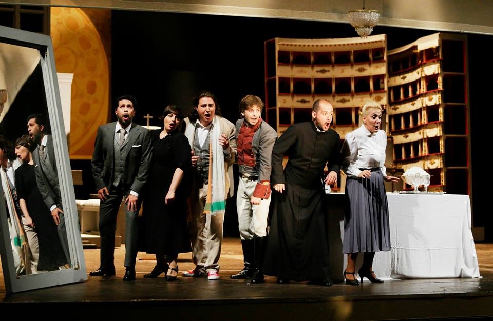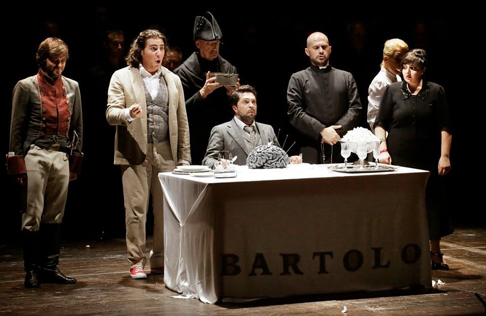 Nová produkcia, ktorá je kolektívnym dielom frekventantov a pedagógov Accademie di Belle Arti di Urbino, je označovaná za formu poloscénickú. Presnejšie, je polojavisková a polohľadisková. Veľká časť akcií sa odohráva v uličkách prízemia, tam sa nielenže spieva, ale zavše tam komparzisti prinášajú aj kulisy. Využité sú tiež bočné lóže a samozrejme i samotné javisko. Nie však do hĺbky, lebo ho ohraničujú makety tamojšieho divadla a v popredí sa nachádza len minimum mobiliáru. Celkovo išlo o koncepciu miešajúcu mladícku recesiu s nadľahčeným humorom i paródiou, nie však zaťaženú ošúchanými gagmi. Bartolo vôbec nie je starý komický dedko, Basiliov portrét rozširuje cirkevnícka charakteristika (so sympatickým nadľahčením tejto háklivej témy) a ich scény majú humor, ktorý nie je z kategórie triviálnych. Popri fešáckom Almavivovi a o čosi hmotnejšom Figarovi trocha plochejšie vyznieva privážna a pritučná Rosina. A kto sa za týmito postavami skrýva? Rosinou je tridsaťročná mezzosopranistka Chiara Amarù, v koloratúre ozaj bravúrna, no vo výraze trocha málo šarmantná. Je to typ mezzo-koloratúry, ktorej by sedeli mužské nohavičkové rossiniovské party. Ako Figaro na festivale debutoval mladý Francúz Florian Sempey, obdarený zvučným, šťavnatým a v každej polohe vyváženým barytónom. Ozdoby a legátové frázy Almavivu (samozrejme, vrátane záverečnej árie Cessa di piu resistere) s ľahkosťou a leskom zvládol Juan Francisco Gatell, Paolo Bordogna bol bezchybným Bartolom a Alex Esposito skvostným Basiliom.+++