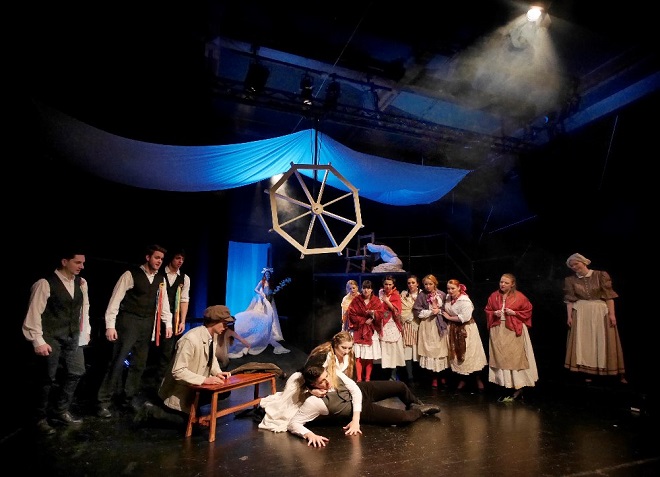 S režijním a scénickým pojetím včetně světel se šikovně vypořádal pedagog konzervatoře Gustav Skála, který jednoduchými, ale působivými nápady vytěžil maximum možností zdejšího jevištního prostoru. S minimem rekvizit, jen kombinací od stropu pověšených šálů s mlýnským dřevěným kolem a vysokou lávkou na pravé straně, na které ve druhém obraze má své místo královna víl. Hloubku scény prodlužuje prosvícený prostor za otevřeným výše postaveným vchodem v zadní stěně jeviště, spojený se scénou šikmou. Samozřejmě důležitou roli hraje vhodné nasvícení. Zásluhou režiséra je též příkladná pohybová práce se všemi hrajícími a propracovaná choreografie lidových tanců.