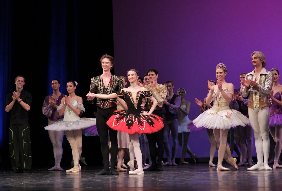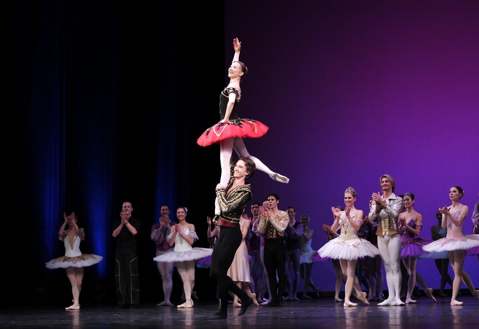 Proti tomu je Balanchinova choreografie v podání našeho souboru naopak spíš petipovská, i když je po technické stránce provedena čistě, esprit dvacátého století postrádá. Do tohoto večera byla použita celá sutia z Theme and Variations, tedy pas de deux hlavního páru, ale také náročná sborová pasáž, ve které se stále ukazuje nejednotnost. Alina Nanu a Adam Zvonař, který si do Prahy odskočil ze svého současného angažmá v Mnichově, jsou ale pro sebe dobrými partnery. Souhra funguje také mezi Nikolou Márovou a Michalem Štípou, kteří tančili Pas de deux z Šípkové Růženky, nicméně všem domácím tanečníkům-mužům nasadil tento večer až příliš vysokou laťku Vadim Muntagirov.