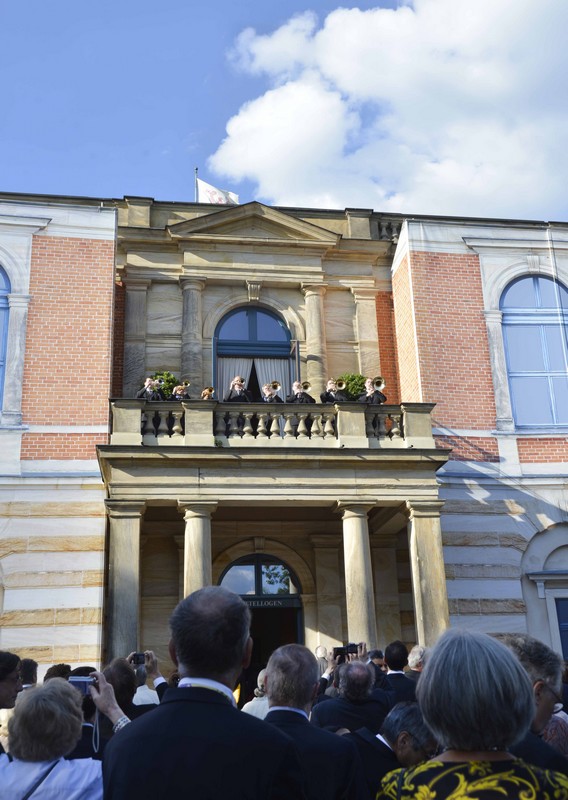 Před představením bylo dosti času obcházet si festivalový dům a nasávat atmosféru krásného a zároveň mýtického prostředí, nezasaženého tentokráte tropickými vedry jako o několik dní nazpět. Na jedné straně jsem byl překvapen mohutnou, realistickou malbou vyvedenou kulisou, překrývající čelní stěnu Festspielhausu, aby zakryla špatný stav fasády. Na druhé straně pak obveselí všudepřítomné, různě rozmístěné barevné figurky skladatele v pozici s dirigentským gestem. Jsou z umělé hmoty a údajně k mání za pět set euro. Čtvrt hodiny před začátkem představení, ohlášeným na šest večer, vystoupí na balkon skupina trubačů, aby upozornili diváky, že se blíží začátek představení. Po pěti minutách se vrátí znovu a stejnou melodii zahrají dvakrát. To již většina diváků urychleně zaujímá svá místa. Pouhých pět minut před šestou nastoupí muzikanti potřetí a uvedenou melodii zahrají třikrát a naposledy, protože Rýnské zlato nemá pauzu.+++===Mladé uvaděčky, jako na povel, zavírají sedm dveří na každé straně parteru o třiceti řadách. Pochopitelně i ve třech pořadích v zadní části hlediště, netypicky se rozšiřujícího odpředu dozadu. Všude je proklamována příkladná akustika sálu a legendární, částečně překrytý orchestr, aby moc nepřehlušoval pěvce – není to ale tak úplně pravda. Záleží na tom, kde sedíte a zda nemáte lístky na krajní místa, ze kterých není část jeviště vidět. A tam právě nastává problém s vyváženou akustikou. Navštívil jsem Bayreuth mnohokrát a vyzkoušel nejrůznější místa v parteru i v jednotlivých pořadích. Na Rýnském zlatu to bylo na kraji jedenácté řady. Pokud sólisté zpívali na protější straně jeviště směrem do publika, byli slyšet méně. Také mi trochu vadilo, že při krásné, sotva slyšitelné a zvukově gradující melodii Rýna vlastně nebylo poznat, kdy hudba začala; na dirigenta samozřejmě vidět není.