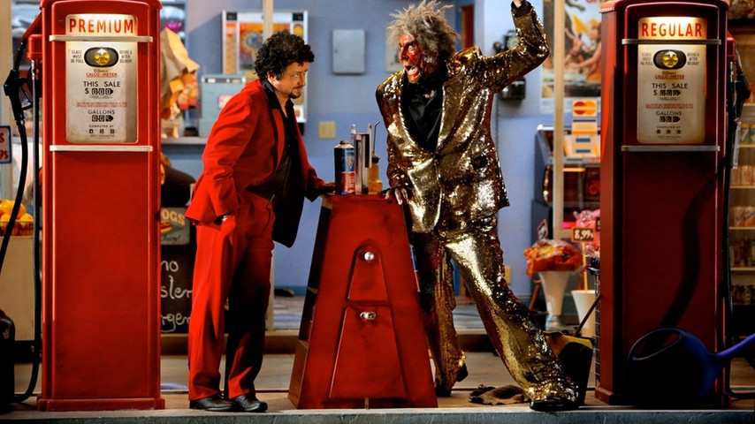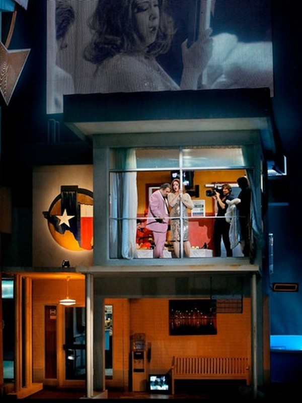 Protože režisér si dal jako hlavní atribut moci a peněz naftu, je základní dekorací benzínová pumpa s motelem. Je to kdesi v Americe na přelomu šedesátých a sedmdesátých let minulého století. Stavba je na točně postavena tak, aby bylo možno při patřičném natočení nahlédnout do jejích interiérů. Nechybí ani bazén naplněný vodou (ale ne z Rýna), ve kterém na začátku děje laškuje Alberich s místními lehkými děvami – dcerami Rýna. V prostoru je navíc umístěn projekční panel, na kterém můžeme vidět dvěma kamerami snímané jednotlivé herecké akce a také ty z dějů, probíhajících za dekorací. Tyto velmi živě snímané detaily, šikovně střihané, dodávají představení úplně jinou dimenzi, jaká vlastně v Bayreuthu ještě nebyla k vidění. Wotan přijíždí v nádherném dobovém kabrioletu Mercedes černé barvy a v hotelovém pokoji si může třeba užívat v posteli s Frickou i Freiou. Obři Fasolt a Fafner na důkaz své síly a moci rozbíjejí basebalovou pálkou vnitřní vybavení prodejny v pumpě za přihlížení vyděšeného prodavače. Zmizení Albericha pomocí kouzelné přilby a možnost proměny v hada nebo ropuchu, čímž se tento skřet vytahuje před Wotanem a Logem, bylo samozřejmě bez problému uskutečněno jednoduchým trikem právě na filmovém plátně. Není místo popisovat řadu dalších, někdy vtipných, jindy i ne zcela povedených akcí. Co však nelze popřít, bylo brilantní herecké zapojení všech aktérů předváděného děje. Zajímavé je, že režisér se inscenování oper až na jednu výjimku (Otello v Basileji) nevěnoval. Navíc dle jeho vyjádření mu bylo jedno, že tento Ring je významný právě dvoustým wagnerovským výročím. Přijal nabídku a dílo inscenoval jako normální inscenaci roku 2013. Před ním již dva jiní nabídku odmítli, a tak Castorf musel vše zvládnout na poslední chvíli v dosti krátkém čase.