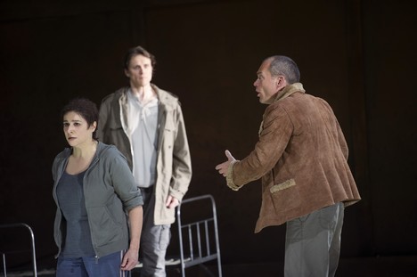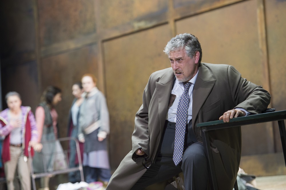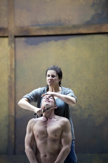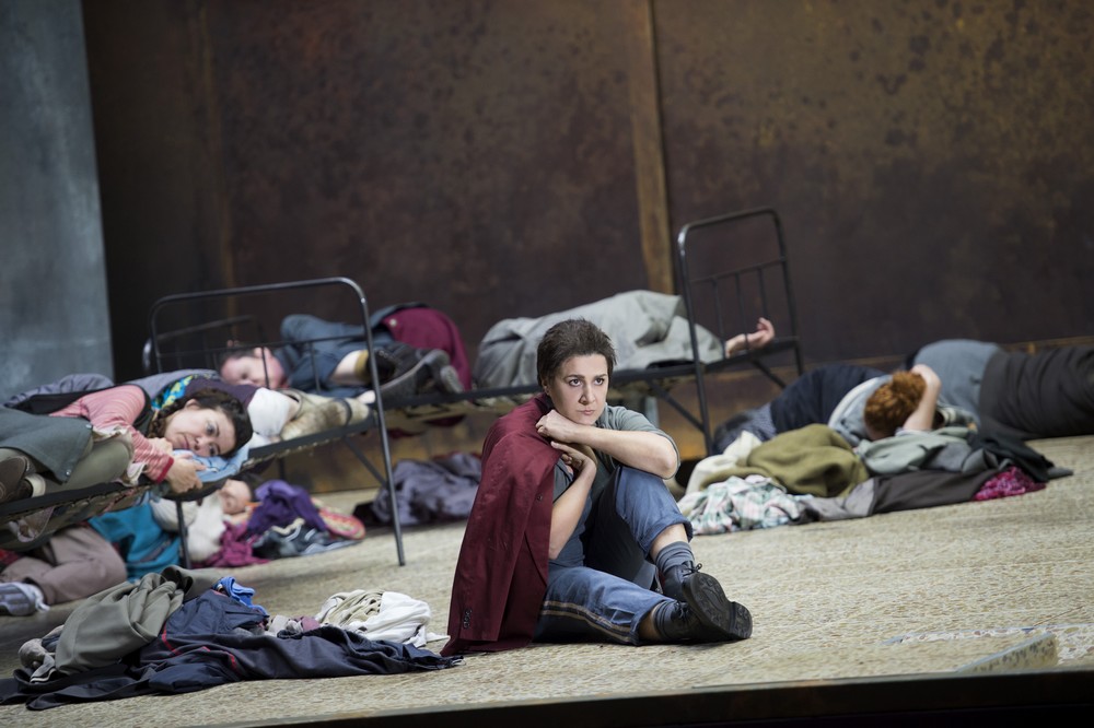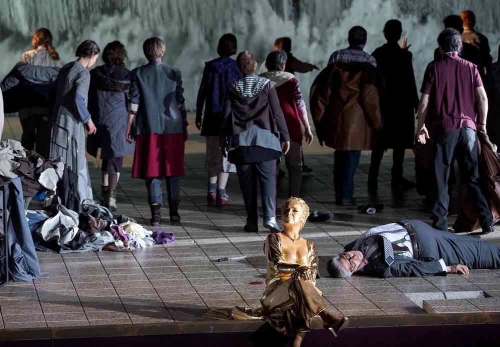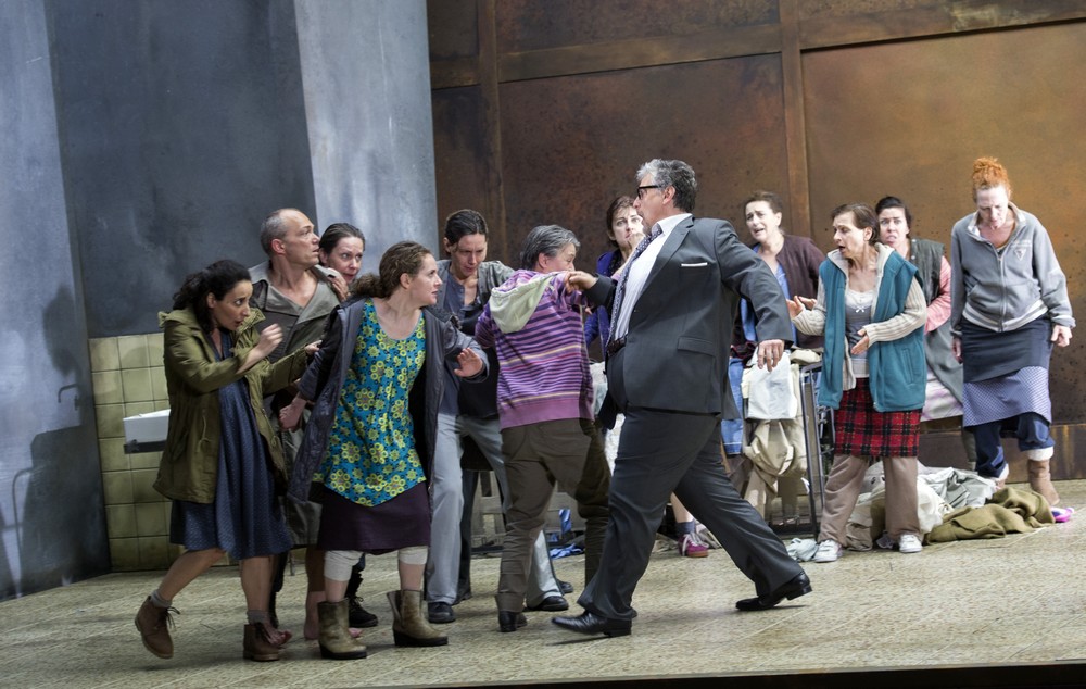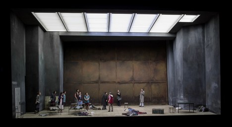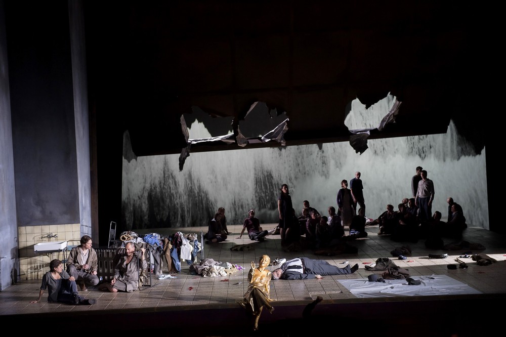 A jak si s dávným antickým mýtem poradili Moshe Leiser a Patrice Caurier? Scénograf Christian Fenouillat vytvořil pro jejich koncepci neměnný a nutno říci, že i značně nevlídný prostor. Je to interiér jakéhosi špinavého hangáru, jehož zadní stěnu tvoří velká rezavá vrata. Kromě umyvadla v levém rohu, několika kusů jednoduchého kovového nábytku (stoly, židle a skelety postelí), hromad šatstva na podlaze a zářivek na stropě už tu nic dalšího není. Vlastně až na Ifigenii a jejích deset přítelkyň, dokonale splývajících s okolím; všechny jsou oblečené do lacině vyhlížejících šatů, zástěr, mikin, svetrů a tepláků (kostýmy Agostino Cavalca). Když se později objeví současně vyhlížející vojáci, přivádějící a šikanující zajaté Řeky, nabízí se otázka, zda snad nemá vizuální podoba inscenace evokovat realitu občanské války na Ukrajině či vzpomínku na etnicky a nábožensky laděné konflikty v bývalé Jugoslávii z devadesátých let dvacátého století. Špinavou a zamaštěnou vnější estetikou se však tvůrci ve snaze o nějaký výklad zřejmě vyčerpali a nic, co by se podobalo osobitému výkladu, už divákům nenabídli. Dokonce se zdálo, že se Leiser s Caurierem omezili jen na poslušné aranžování postav a sboristů na scénu přesně podle dávných pokynů libretisty Nicolase-Francoise Guillarda. Došlo tak i na neplánovaně úsměvné výjevy z operního pravěku, jakými bylo strašidlácké ohrožování Oresta bohyněmi pomsty Erinyemi (z děr v podlaze a pod vraty po něm sahaly zakrvácené paže a připlazila se i zombie varianta Klytaimnéstry), nechtěně pobavila i Ifigenie, snažící se uškrtit svetrem a následně i Orestes, předpisově vyhrožující sebevraždou s dýkou namířenou na vlastní srdce.