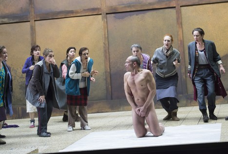 Přesto nabídla i tato „nerežie“ přinejmenším jeden působivý výjev. Před obětováním Oresta natáhly kněžky na podlahu kus igelitu, načež muže přivedly, svlékly, obřadně vydrhly žínkou a pak jej nechaly na materiál (jehož věcnou předností je snadná omyvatelnost) pokleknout. V pohledu na klečícího nahého muže, který se zavřenýma očima a rukama zakrývajícíma přirození očekává svůj osud, a na skupinu osob, jež ho sice k tomuto údělu připravila, ale teď od něj raději odvrací zrak, bylo obsaženo cosi velmi podstatného z novozákonního příběhu. Stačí dodat jen ono Pilátovo „Ecce homo“, pronesené vedle zmučeného Krista směrem ke krvežíznivému davu… Vzhledem k více než konzervativnímu celkovému pojetí potěšilo na závěr i řešení příchodu bohyně Diany: rezavá vrata se konečně otevřela a z hlubin jeviště přikráčela kompletně pozlacená krasavice, aby se rozšafně posadila na kraj pódia. Po jejích moudrých slovech se všichni protagonisté svorně zahleděli k nové budoucnosti, zosobněné na pozadí promítaným mořským příbojem.