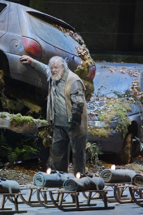Pesimistickosť Birtwistleovej/Harsentovej vízie ešte umocňuje pochmúrna, bezútešná inscenácia Alvisa Hermanisa (režiséra a scénického výtvarníka v jednej osobe). Hermanis zasadil príbeh do krajiny po globálnej katastrofe, kde kresťanstvo v boji s primitívnymi prírodnými silami ťahá za kratší koniec. Náter civilizácie je preč, víťazí právo silnejšieho – až za hranice najzákladnejších ľudských pravidiel (napríklad „neskonzumuješ blížneho svojho“). Hermanisova koncepcia, odkazujúca na katastrofické postapokalyptické sci-fi filmy, rozdeľuje javisko na dve časti. Prvú, s ošarpanými stenami, plechovými sudmi s ohňom a projektovanými obrazmi povodní či horiacich tovární, obývajú zúbožení bezdomovci – smutný pozostatok civilizácie. V druhej časti, ktorej dominuje vrakovisko áut potiahnutých rašiacou zeleňou, víťazia sily prebúdzajúcej sa prírody. Jej symbolom je Zelený rytier – strašidelná postava obrastená trávou na obrovskej skulptúre koňa. Asi neprekvapí, že predstaviteľ Zeleného rytiera a Bertilaka de Hautdesert je ten istý spevák (v tomto prípade charizmatický basbarytonista John Tomlinson).