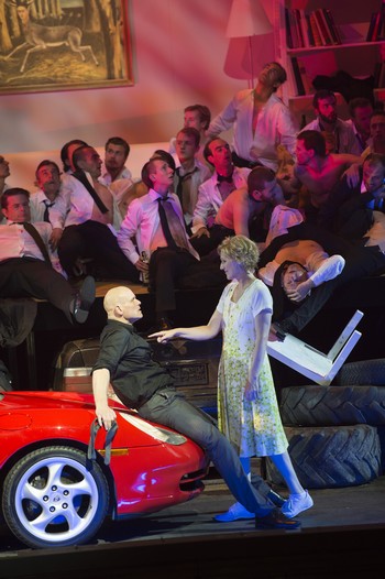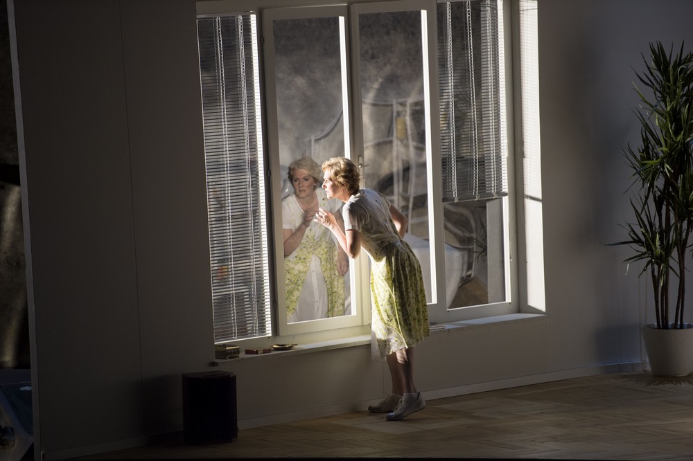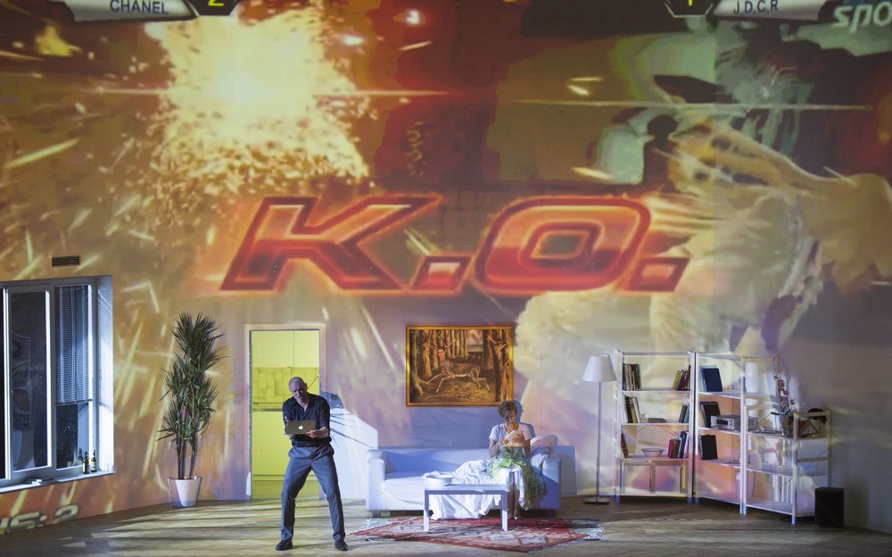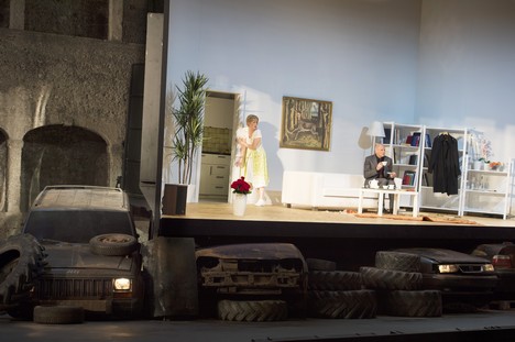 Peter Konwitschny so svojím výtvarníkom Johannesom Leiackerom sa v Rihmovej predlohe doslova našli. Ako tvrdia, sémantizujú hudbu, jej zmysel prenášajú do scénických obrazov. Nešli cestou asociácií plynúcich z názvu diela, či mien hlavných postáv, ale sústredili sa výlučne na vibrujúci konflikt medzi ženou a mužom. Do svetlých farieb ladená obývačka, postavená na vrakovisku áut, v pozadí pôvodné kamenné arkády jazdiarne (v dramaticky zlomových situáciách v rôznych farebných ladeniach) a predovšetkým detailná kresba charakterov – to sú hlavné znaky inscenácie.Konwitschny má všetko premyslené a zdôvodnené, niet drobnosti, ktorá by nezapadala do koncepcie. Od mexického koberčeku, cez tequilu až po symbolický obraz zraneného jeleňa s tvárou ženy (ide o reprodukciu maľby mexickej surrealistickej maliarky Fridy Kahlo). V druhej časti večera Konwitschny šokuje ťažkým pôrodom ženy, zobrazeným vo virtuálnom svete počítačových projekcií, resp. filmu. Zrazu sme v inom svete, mobily, tablety, rozmanité ikony, rozohrávajú sa apokalyptické „vojnové hry“. Aj táto extrémna vizualizácia má oporu v hudbe a tvorí predpolie k tragickému záveru. Obaja mŕtvi spievajú ľúbostný duet. Bez orchestra, v utíchajúcom zvuku.