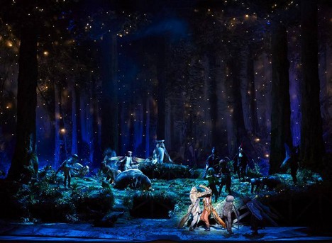 Výtvarnice Amra Bergman-Buchbinder vytvořila pro svůj zdejší debut bujný les prorostlý mechem, kterým v ranní mlze vesele pobíhají zajíci a ježci ve vtipných kostýmech. Pohyblivé kmeny stromů slouží jako prvky definující prostor, s jejich pomocí se vytvářejí hrací plochy a Schenk, znalý režie osob, jich dokáže bohatě využít.