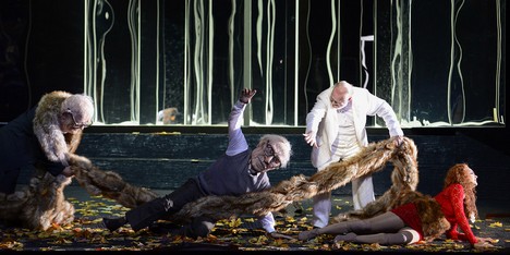 Setkání Bystroušky se Zlatohřbítkem – vpozadí hyperrealistický les. „Kóříte?“ „Žerete králíky?“ Lišák přinese dva papírové pytlíky z fastfoodu – lítá jim z toho peří. „Tož to rovnó k farářovi.“ – Revírník Janáček šílí žárlivostí a trhá liščin kožich doslova na kusy. Sova, Datel mají velkokapacitní ptačí hlavy a odtud se ozývají hlasy, pravda, nepříliš čitelně. Orchestr téměř všechny přehluší – přezpívá jej Bystrouška, Revírník, Harašta, Revírníková… Liščata – hurá, na chvíli žlutavější, teplejší světlo na jevišti. Aby byla hravá, házejí po sobě podzimní barevné listí. Jenomže celá ta jejich hravost jako by tam nebyla – o tu přece v této inscenaci vůbec nejde. Kupodivu dojde i na závěrečný zpěv Revírníka Janáčka – „Óoj, ale není tu Bystroušky!“, hledá ji někde v hledišti. I Skokánka tam hledá, ten mu na jevišti taky neskočí na nos, aby mohl zazpívat: „Totok nésem já, totok beli dědóšek…“ Ozývá se odněkud za jevištěm. Režisér je důsledný – nesmí mu do inscenace proniknout ani náznak lidského (zvířecího) tepla. Vidí Bystroušku z velkého zobecňujícího nadhledu – je to opravdové drama.