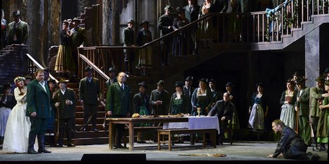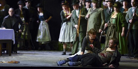 Zbývají tři nejdůležitější protagonisté. Američanka Sara Jakubiak debutovala v Semperoper v lednu 2013 v roli Rosalindy v Netopýrovi a už tehdy se představila jako majitelka neobyčejně variabilního sopránu, schopného přirozeně přecházet z koloraturních pasáží až do poloh vysloveně dramatických (recenzi Netopýra jsme přinesli zde). Navzdory rozpačitému režijnímu vedení se nyní v případě Čarostřelce prosadila Jakubiak i jako talentovaná herečka: v dlouhých mluvených pasážích působila mezi ostatními rodilými mluvčími paradoxně nejpřirozenějším a nejuvolněnějším dojmem. Pro basistu Georga Zeppenfelda patří Kašpar k parádním rolím; ztvárnil ho i na vynikající nahrávce Bruno Weila pro label Deutsche Harmonia Mundi. Kromě charakteristického vokálního projevu tohoto populárního drážďanského sólisty je třeba vyzdvihnout i jeho herecké nadání – zralý pěvec ztvárnil Kašpara s velmi přesvědčivým mladickým elánem. Největší tíha režijní bezradnosti pak ležela na tenoristovi Michaelu Königovi. Co naplat, že disponuje technicky jistým hlasem s tou správnou barvou pro německý romantický repertoár, když z něj tvůrci učinili jakéhosi neohrabaného valibuka v kšiltovce, vojenském vaťáku, kapsáčích a kanadách, který buď vstoje či vleže řeší zapeklitou otázku, jak nejlépe držet pušku, aby to nepůsobilo směšně…