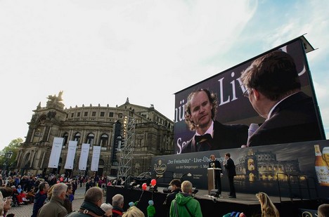 Prosím všechny případné nezletilé čtenáře, aby tento odstavec raději přeskočili – obsahuje totiž reklamu na alkoholické nápoje. Konkrétně se jedná o výrobky tradičního saského pivovaru Radeberger, které se v pátek 1. května 2015 čepovaly na náměstí před drážďanskou Semperovou operou, a to dokonce zadarmo. Improvizovanému tržišti, tvořenému několika stánky se zmíněnými chmelovými specialitami, pak vévodila konstrukce s obří obrazovkou a pódiem. Na něm lákal žoviální moderátor ke sledování hlavní atrakce celého slavnostního dne: přímého přenosu premiéry opery Čarostřelec Carla Marii von Webera.