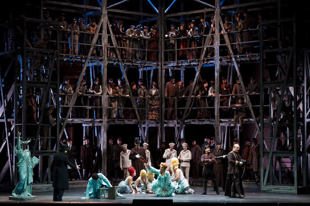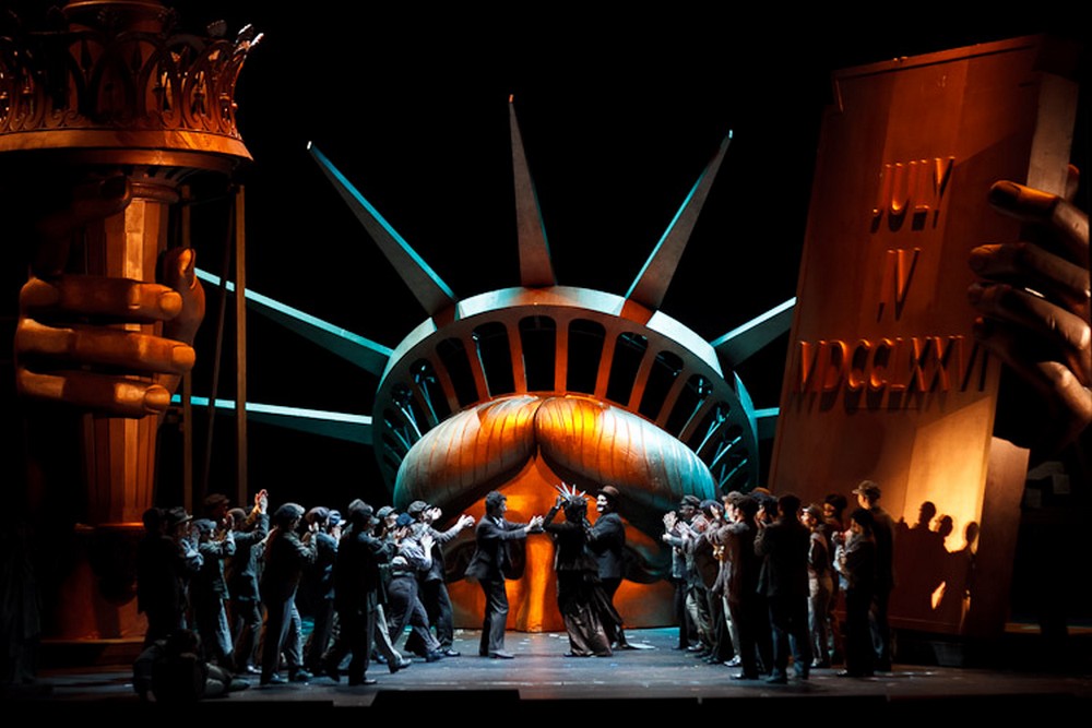 Nezpochybnitelné a jasně identifikovatelné jsou tak pouze obří artefakty na scéně (podle návrhu Heike Scheele): hlava s hvězdnou korunou, paže s pochodní a ruka s tabulkou, připomínající datum vyhlášení nezávislosti Spojených států, zkrátka komponenty náležející Soše svobody. Všechny monumentální díly jsou skryty pod lešením, lze tedy tušit, že jsme možná ve Francii roku 1886 a socha se právě připravuje k převozu přes oceán. Stejný osud přichystal i Abbé Prévost hrdince svého románu Manon Lescout – paralela je tedy zřejmá.