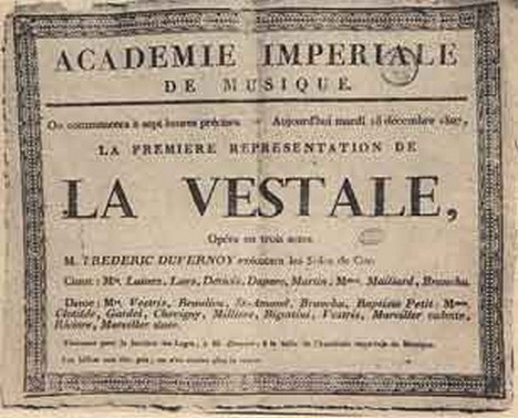 „Jak chcete, aby někdo něco nového vynalezl, když já, Spontini, prohlašuji, že má předchozí díla nemohou být nikdy překonána. Také prohlašuji, že po Vestálce nebyla napsána jediná nota, která by nebyla ukradena z mé partitury.“