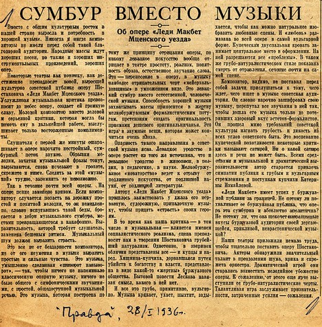 Kritik Izvěstije nám později vyprávěl, že se Stalina zeptal, jak se mu opera líbila, a ten odpověděl: „Eto sumbur, a nět muzyka“. Dva dny po představení psal tentýž kritik ve svém listu zcela ve Stalinových intencích (pochopitelně ho nejmenoval) a celou operu ztrhal (článek Сумбу́р вме́сто му́зыки vyšel 28. ledna 1936 v listu Pravda, poznámka překladatelky). To bylo první a poslední představení Lady Macbeth ve Velkém divadle. Němirovič-Dančenko ji ve svém divadle hrál dál. Řekl mi, že chyba Velkého divadla spočívala v nedobrém a kvapném nastudování, z toho důvodu ji logicky Stalin musel odmítnout.