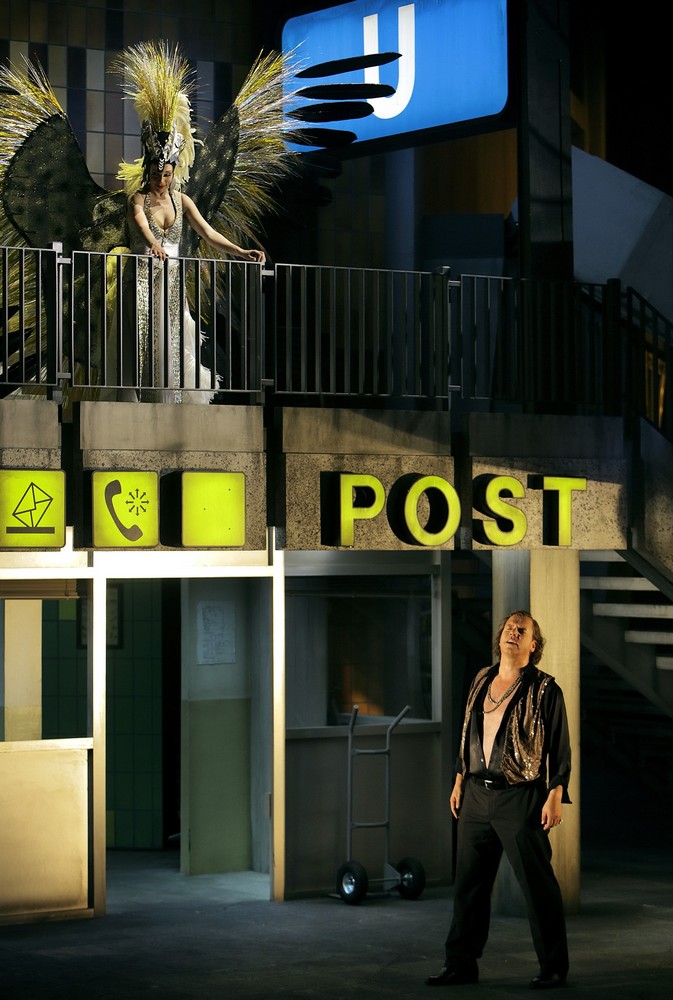 Z útrob scény doťahujúc si pred zrkadlom improvizovanej maskérne rúž, vystupuje Erda sledovaná kamerou na námestie. Wotan sa jej pýta, „ako zabrzdiť valiace sa koleso“. Pri víne a špagetách na Alexanderplatzi ho však Erda pod svetovými hodinami môže uspokojiť len jedným spôsobom. Ako ľahostajná diva v kožuchu a parochni pokľakne a rozopne Wotanovi rázporok…