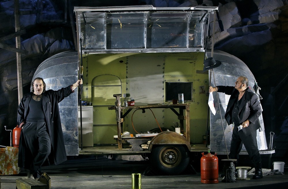 V otvorenom striebornom obytnom prívese (metafore Nibelheimu z Rýnskeho zlata) kuje samozvaný „červený“ ideológ a rojko Mime meč pre chovanca Siegfrieda a neskôr plány, ako získať prostredníctvom neho zlatý poklad Rýna, ktorý sa momentálne nachádza vo vlastníctve drakónskeho desperáta Fafnera. Tu ho vyhľadá aj Wotan v postave Wanderera, tarantinovsky poňatý v čiernom kabáte, cowboyskom klobúku a slnečnými okuliarmi, ktorý ho vyzve do hádankovej hry. V obsiahlom dialógu podloženom hustou spleťou leitmotívov kulminuje Wotanov part vo výškach, presahujúcich takmer do tenorovej polohy. cieľom nie je priblíženie sa Mimemu, lež poukaz na postavu Siegfrieda, ktorého úlohou bude znovu ukovať rozbitý meč Nothung. Mime síce rozpozná pútnika ako Wotana (Wotan si strhne z tváre slnečné okuliare a demonštratívne ich rozdupe), no premárni šancu zistiť recept ako ukovať rozbitý meč. Castorf režíruje túto scénu opäť staticky neinvenčne. Gró drámy sa skôr deje v orchestrisku. Petrenko jasne definuje jednotlivé témy v spleti leitmotívov a ich modulácií. Nezlieva ich do seba, umne nasadenými rubatami zrozumiteľne artikuluje ich význam pre priebeh drámy i Castorfovho príbehu. Nebojácnosť Siegfrieda je v Castorfovej réžii „hrou s ohňom“: prv než si ukuje Nothung, zvažuje použiť celý arzenál zbraní od podomácky vyrobenej bomby až po kalašnikov, pred ktorého salvami varujú aj letáky v prestávke pred druhým dejstvom. Svoje miesto má na javisku aj nemá postava medveďa inscenovaná ako ničnetušiaceho proléta tiahnuceho sa celým cyklom od Rýnskeho zlata. Najprv ako barman na čerpacej stanici pod Walhallou, neskôr vo Valkýre ako uväznená učiteľská inteligencia a v Siegfriedovi ako autodidaktik, ktorý sa z Mimeho „revolučnej knižnice“ márne pokúša rozdúchať oheň revolúcie. V postave stvárnenej Castorfovým dramaturgom Patricom Seilbertom sa táto nemá rola postupne stala miláčikom publika.