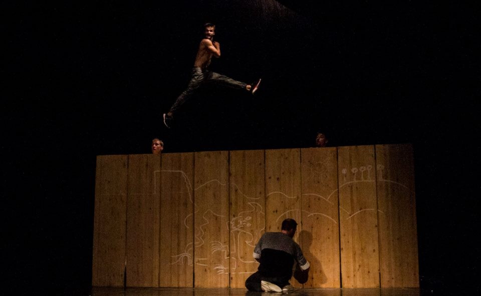 Walls and Handbags, o zdech a taškách? Spíš o tom, co se skrývá za nimi a v nich, o tom, jak vytáhnout fantazii jako králíka ze zapomenutého klobouku. Na scéně při začátku představení jedna zeď stojí, připomíná prkennou ohradu některého z nezbytných plácků určených pro klukovské hry. Malý chlapec s taškou křídy pomalu nakreslí na dřevo podobu pěti panáků, svých dospělých kamarádů, kteří se postupně objeví na scéně a zdánlivě pevnou ohradu rozeberou na devět segmentů, bytelných dřevěných lavic, které se stanou jedinými rekvizitami inscenace. Mimochodem, počet účinkujících akrobatů vychází z čistě náhodného procesu, jak se formoval vznikající soubor, ale všimněte si, že je to také tradiční číslo klukovských part: pět je Rychlých šípů, malých hrdinů Karla Poláčka i Trnkových uličníků zkoumajících zahradu…