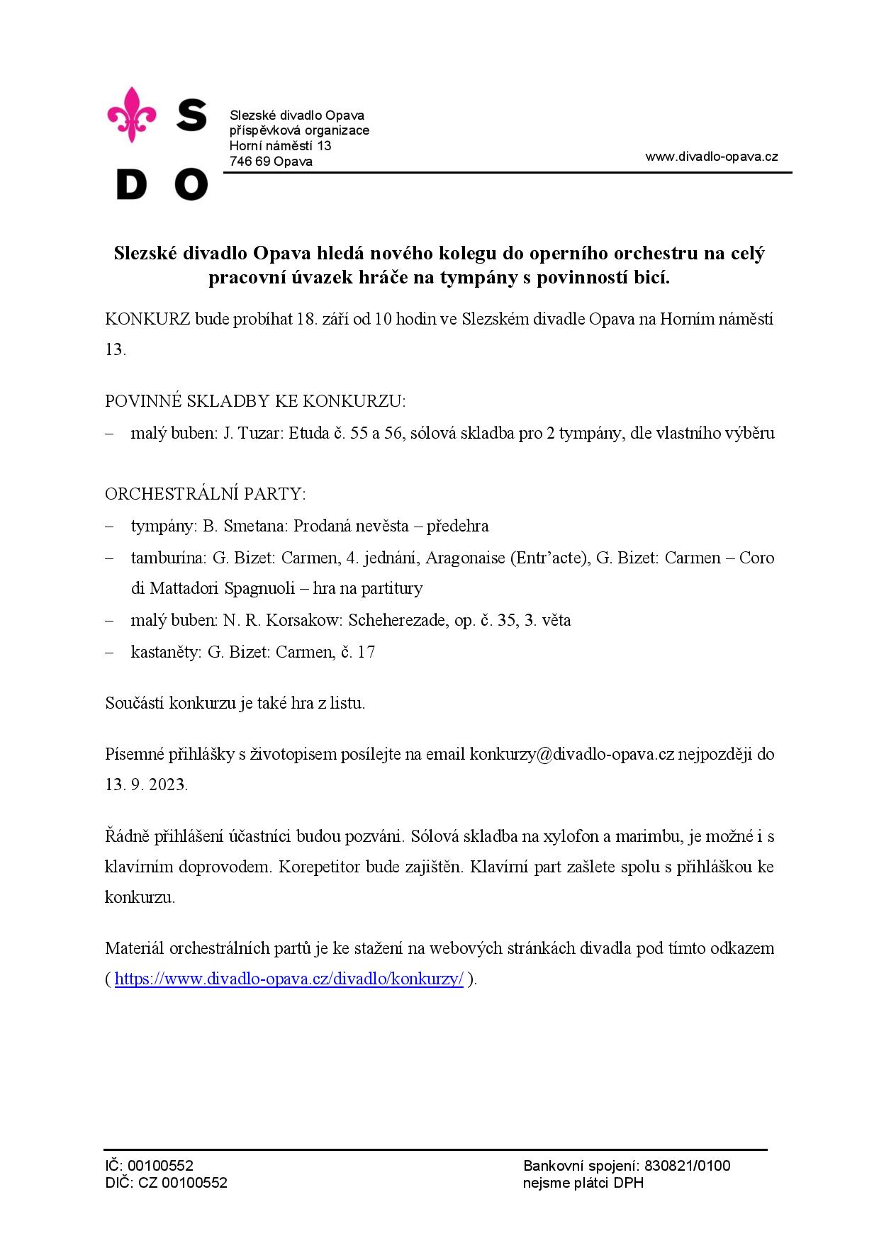 Inzerce Slezské divadlo Opava hledá do operního orchestru hráče na tympány s povinností bicí Publikováno 11/07/2023 sdílejte: 0 minut čtení sdílejte: TémataSeznam inzerátů Sdílet článek Facebook email zkopíruj odkaz vytisknout sdílejte: Předchozí článek Skladatel, dirigent a klavírista Jan Kučera: Skladatelská činnost je vrcholně asociální Další článek Festival Za poklady Broumovska chystá koncert na téma Dech jako fenomén 0 0 hlasy Ohodnoťte článek Odebírat Přihlášení Upozornit na nové a další komentáře nové odpovědi na můj komentář Label {} [+] Jméno* E-mail* Webová stránka Label {} [+] Jméno* E-mail* Webová stránka 0 Komentáře Nejstarší Nejnovější Most Voted Inline Feedbacks Zobrazit všechny komentáře Načíst další