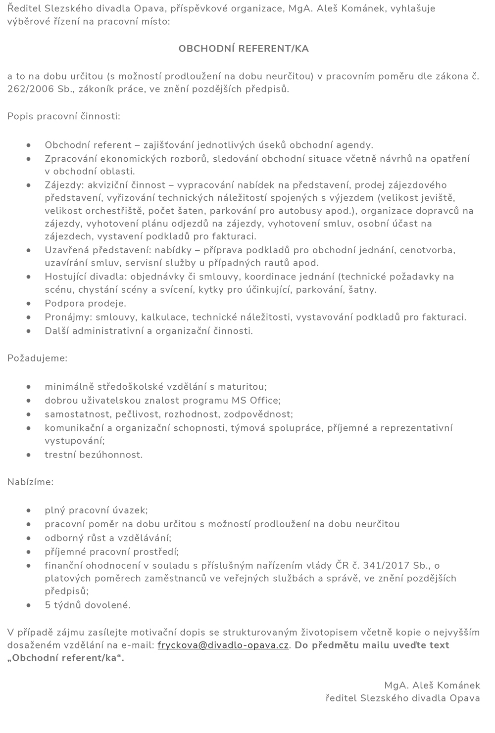 Inzerce Slezské divadlo Opava vyhlašuje výběrové řízení na pozici: Obchodní referent Publikováno 01/12/2022 sdílejte: 0 minut čtení sdílejte: TémataSeznam inzerátů Sdílet článek Facebook email zkopíruj odkaz vytisknout sdílejte: Předchozí článek Jihočeské divadlo dostane od města méně financí, než očekávalo Další článek Mezzosopranistka Libuše Márová: Vědět, kdy skončit, je také velké umění 0 0 hlasy Ohodnoťte článek Odebírat Přihlášení Upozornit na nové a další komentáře nové odpovědi na můj komentář Label {} [+] Jméno* E-mail* Webová stránka Label {} [+] Jméno* E-mail* Webová stránka 0 Komentáře Nejstarší Nejnovější Most Voted Inline Feedbacks Zobrazit všechny komentáře Načíst další