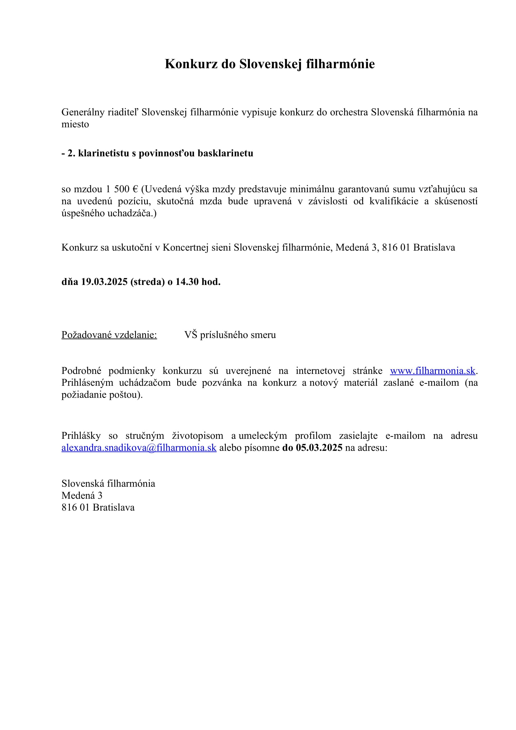 Inzerce Slovenská filharmonie vypisuje konkurz na místo 2. klarinetisty s povinností basklarinetu redakce Publikováno 13/01/2025 sdílejte: 0 minut čtení sdílejte: TémataSeznam inzerátů Sdílet článek Facebook email zkopíruj odkaz vytisknout sdílejte: Předchozí článek Operní panorama Heleny Havlíkové (508) – Operní dychtivost mládí Další článek Týden s hudbou: Koncerty, opery, TV a streamy (3) 0 0 hlasy Ohodnoťte článek Odebírat Přihlášení Upozornit na nové a další komentáře nové odpovědi na můj komentář Label {} [+] Jméno* E-mail* Webová stránka Label {} [+] Jméno* E-mail* Webová stránka 0 Komentáře Nejstarší Nejnovější Most Voted Inline Feedbacks Zobrazit všechny komentáře Načíst další
