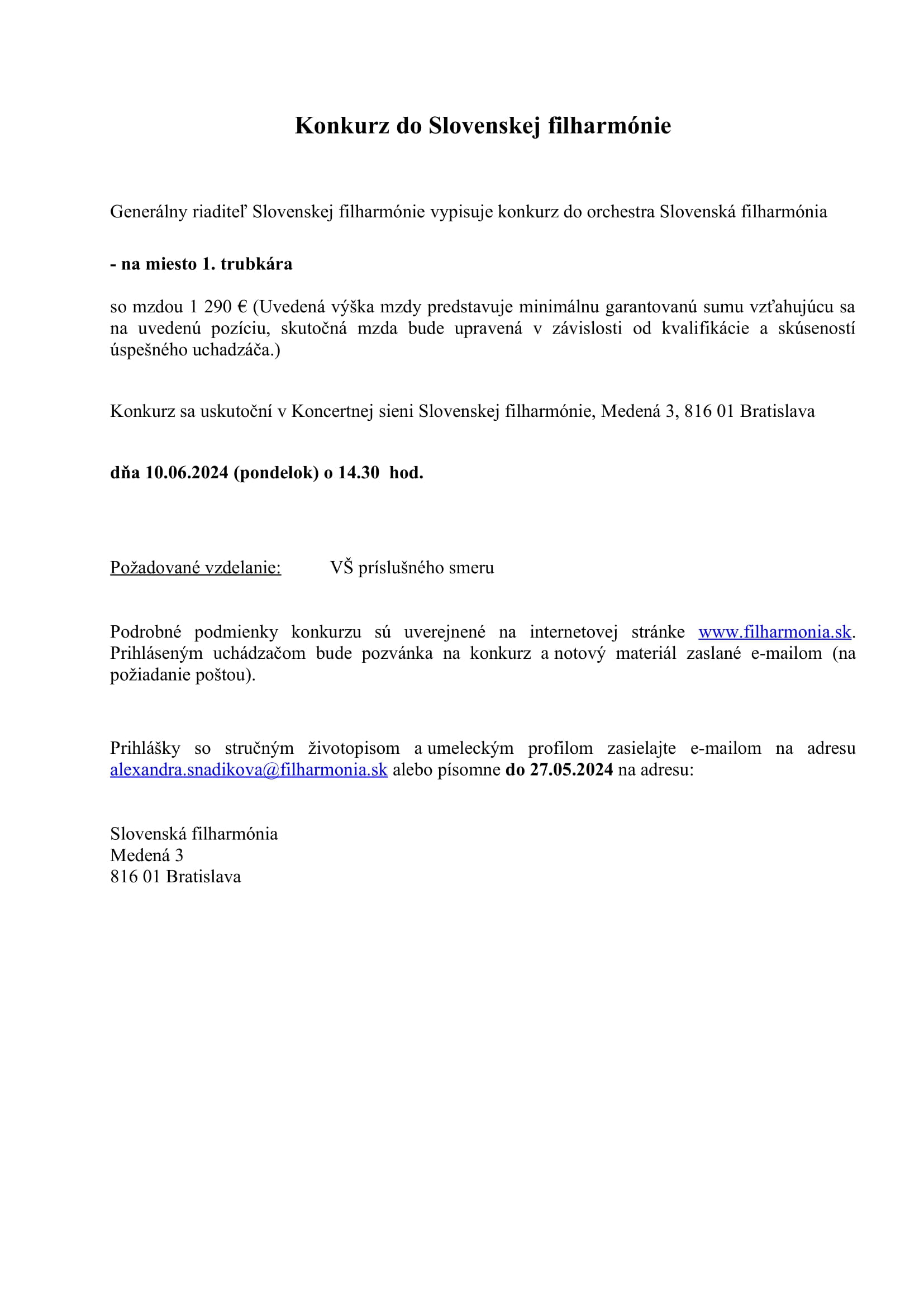 Inzerce Slovenská filharmonie vypisuje konkurz na pozici 1. trumpetisty redakce Publikováno 24/04/2024 sdílejte: 0 minut čtení sdílejte: TémataSeznam inzerátů Sdílet článek Facebook email zkopíruj odkaz vytisknout sdílejte: Předchozí článek Vychází komplet legendárních nahrávek souboru Musica Antiqua Praha Další článek Světový den akordeonu v Praze: Minifestival uvede trojici koncertů 0 0 hlasy Ohodnoťte článek Odebírat Přihlášení Upozornit na nové a další komentáře nové odpovědi na můj komentář Label {} [+] Jméno* E-mail* Webová stránka Label {} [+] Jméno* E-mail* Webová stránka 0 Komentáře Nejstarší Nejnovější Most Voted Inline Feedbacks Zobrazit všechny komentáře Načíst další