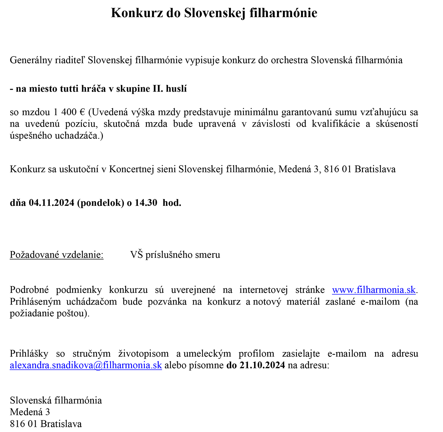 Inzerce Slovenská filharmonie vypisuje konkurz na tutti hráče skupiny II. houslí Publikováno 21/09/2024 sdílejte: 0 minut čtení sdílejte: TémataSeznam inzerátů Sdílet článek Facebook email zkopíruj odkaz vytisknout sdílejte: Předchozí článek Mezinárodní festival staré hudby Musica ad confluentem přivítá soubor La Petite Écurie Další článek V Lipsku objevili dosud neznámé dílo Wolfganga Amadea Mozarta 0 0 hlasy Ohodnoťte článek Odebírat Přihlášení Upozornit na nové a další komentáře nové odpovědi na můj komentář Label {} [+] Jméno* E-mail* Webová stránka Label {} [+] Jméno* E-mail* Webová stránka 0 Komentáře Nejstarší Nejnovější Most Voted Inline Feedbacks Zobrazit všechny komentáře Načíst další