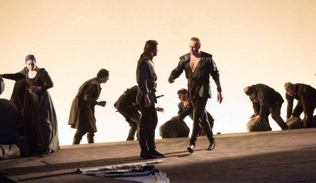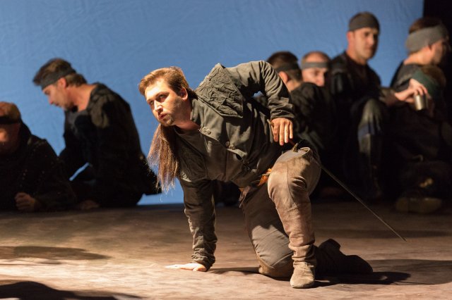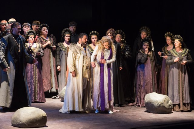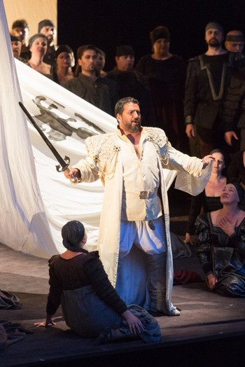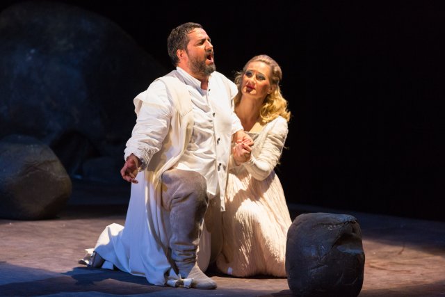 Zde bylo vše trochu jinak, režie s psychologií postav zřejmě tak nepracovala jako v inscenaci budějovické, ale ani té nedávné plzeňské! Nebo i pracovala, jen to není příliš zřejmé. Zde jako by vše v duetu bylo obětováno finálnímu hrdinnému béčku Efe Kislaliho na rampě, či zde již ba i pod rampou, v závěru duetu („Si, pel ciel marmoreo guiro!“). Hostující turecký tenorista až z Istanbulu, Efe Kislali, vládne jistě barytonálním tenorem hutného jádra, pro partii Otella zajisté adekvátním, ve vyšších polohách i celkem průbojným. Jen jedno jistě ne nepodstatné adjektivum k jeho pěveckému projevu nemohu použít, totiž krásný… Ale jeho scénické pojetí mne ponechávalo dosti chladným. Byl v průběhu večera, po více než slibném začátku ve vstupním „Exultate“, stále více stereotypní a jeho rádoby expresivní výkřiky, povrchní, nejdoucí zevnitř, stále stejné, už byly v průběhu večera docela nudné. Nádherný duet v 1. dějství mezi Otellem a Desdemonou mne ponechal absencí hlasové modulace i povrchního výrazu dosti chladným, jako si nikdy v minulosti nevzpomínám. Co však dosti oživovalo projev tureckého tenoristy, byl častý rytmický nesoulad s orchestrem. Jako by první doba se zde počítala jinak. Bylo to v prvé části do pauzy místy rušivé, v průběhu večera „svůj“ osobní metronom již nacházel, ale poněkud nízké tóny konců decrescendovaných frází ne tak zcela. Jen režijní náznak závěru duetu, kdy již je jakoby anticipován tragický epilog díla, byl zajímavě koncipován a byla to světlá chvíle režie. Obdobně jako velká sborová scéna přijetí benátského poselstva. Na jinak velmi funkcionalisticky jednoduché scéně s neustále se přemisťujícími balvany, které vymezují jednotlivé postavy, scény, monology, dialogy i ansámbly. Scéna je pro účely pódia v Litomyšli svou jednoduchostí realizace doslova jako stvořená!