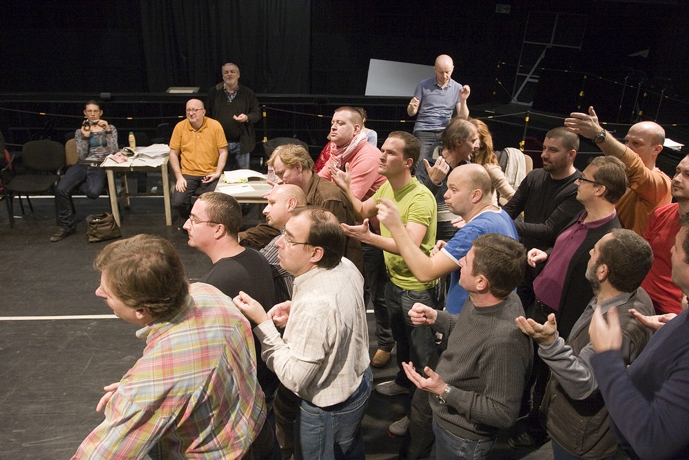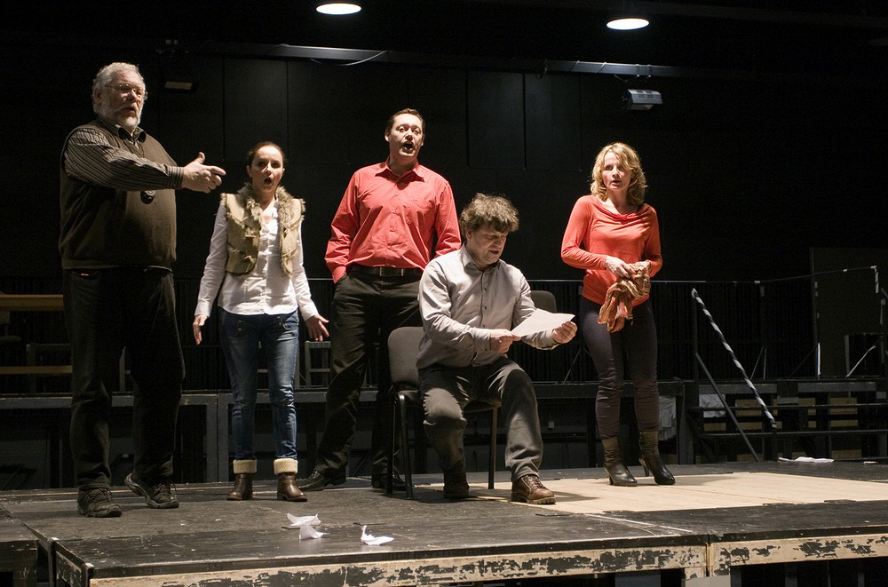 Na javisku sa stretneme s troma druhmi hereckého prejavu. Jedna skupina sú sólisti a zbor, ktorí interpretujú Rossiniho Barbiera, ďalšia pomocníci (šepkárka a inšpicient), ktorí pomáhajú vytvárať divadelné situácie a vstupujú do deja a potom spoločnosť dobre situovaných ľudí, ktorí si predstavenie kúpili, aby im spríjemňovalo večeru. Sólisti sú výborní nie len po speváckej, ale aj po hereckej stránke.