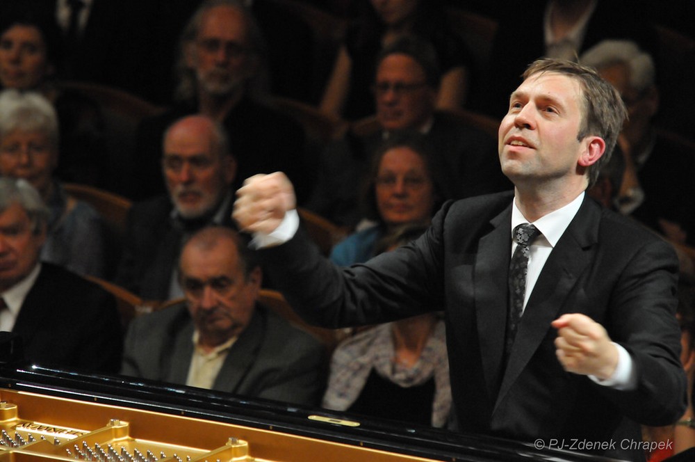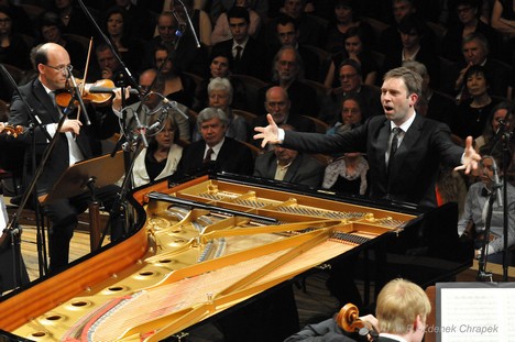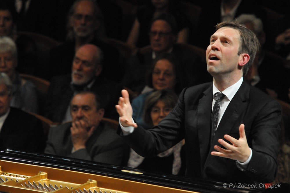 Vraťme se k programu norského klavíristy Andsnese: po neobarokním koncertu říznutém jazzem Dumbarton Oaks Igora Stravinského hraném jen v šestnácti hráčích přišel poněkud překvapivě na řadu sbor a capella – Messiaenův motet O sacrum convivium, provedený Pražským filharmonickým sborem (sbormistr Lukáš Vasilek). Stěhování pultů a židlí z pódia a pak zpátky trvalo sice déle než kratinká jednovětá Messiaenova skladba, ale přítomnost sboru si vyžádala především následující Beethovenova skladba: Fantasie c moll pro klavír, sbor a orchestr, op. 80. Tu provedl a zároveň řídil Leif Ove Andsnes od klavíru, seděl přitom za křídlem zády k publiku a otočen do orchestru. Často ještě dohrával jednou rukou běhy na klaviatuře a druhou již dával nástupy členům orchestru. Přesto jeho hra splňovala ta nejpřísnější kritéria virtuozity, přesnosti a dokonalé koncentrace – vždyť se nahrávala živě na CD pro Sony Classical.