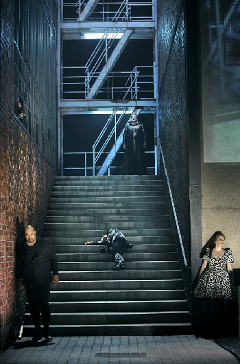 Denićova (už opäť) fantastická a do detailov prepracovaná scéna na točni však medzi týmito dvoma obrazmi ponúka z každej strany ešte ďalšie dva. Na jednom konci vidíme strmé požiarne schodisko už spomínaného činžiaku. Tu sa odohráva aj prvá scéna s Nornami, ktoré rekapitulujú doterajší priebeh deja a vysvetľujú príčiny blížiaceho sa konca sveta. Poobliekané ako divoké bezdomovkyne kladú do klietky pod schodiskom sviečky a všakovaké rituálne predmety pripomínajúce obrady woodoo.
