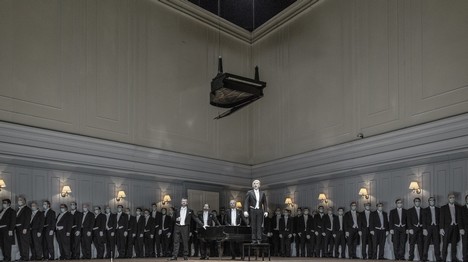 Špinar pak předvedl naprosto příkladnou práci s libretem, kterou provedl i již zmíněný Treliński, když si libreto skutečně přečetl slovo od slova a takto podrobně jej také interpretoval. Celkovou režijní koncepci popsal Špinar tak, že nechtěl tvořit stejně jako u činoherního představení, ale uvědomoval si rozdílnost opery od divadelní hry: „I ta nejdramatičtější opera musí mít výrazné jevištní gesto, stavím proto především na obrazech.“ (časopis Národní divadlo, květen 2015, strana 14) Ačkoli se zdá Špinarovi jeho režijní přístup k opeře nečinoherní, ve skutečnosti se ve světě opery jedná o opak. Jeho přístup je pro operu velmi činoherní v tom nejlepším slova smyslu – blahodárný a obohacující.Opera je režijně rozdělena na dvě výrazné části – první tvoří první dvě jednání, druhá část pak jednání poslední. První část se odehrává ve vězení, v jakési zničené a počmárané místnosti historizující architektury, snad v bývalém koncertním sále nebo významném salonu. Zašlá sláva staré místnosti však jako by stále promlouvala. V jejím středu nalézáme staré koncertní křídlo, bez nohou a rozbité – symbol pochroumané svobody, orla s poraněným křídlem. Tato symbolika je snad až moc abstraktní a je právě dokladem toho, jak se režisér vyrovnává s přítomností hudby na jevišti a jak se ji snaží inscenačně zhmotnit. Inscenační nebo vizuální ztvárnění hudby je vždy dost problematické a často upadá do zajetých kýčů (houslové klíče, tištěné noty, obrázky hudebních nástrojů a podobně). Špinarovi se podařilo parodovat a karikovat operní praxi (mimové jako pyšní operní pěvci), ale také hráče v orchestřišti (mimové předstírají hru u prázdných pultů) a sborové scény (třetí jednání – sboristé zpívají u klavíru jako na koncertě).