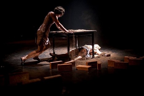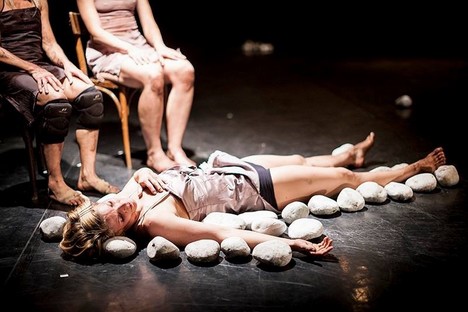 Choreografie Traces, které patřila druhá polovina večera, pochází z dílny izraelského autora Josepha Tmima a představuje podívanou neméně zajímavou. Inscenace také stojí na pomezí mezi tancem a pohybovým divadlem, trojice žen se v ní dostává prostřednictvím sól, duetů, trií a různých druhů též spíše herecké interakce do vztahů, jež zanechávají stopy – traces. Ty jsou vytvářeny zcela konkrétně a materiálně – hlavními rekvizitami, jimiž je manipulováno, jsou kameny, cihly a zemina.