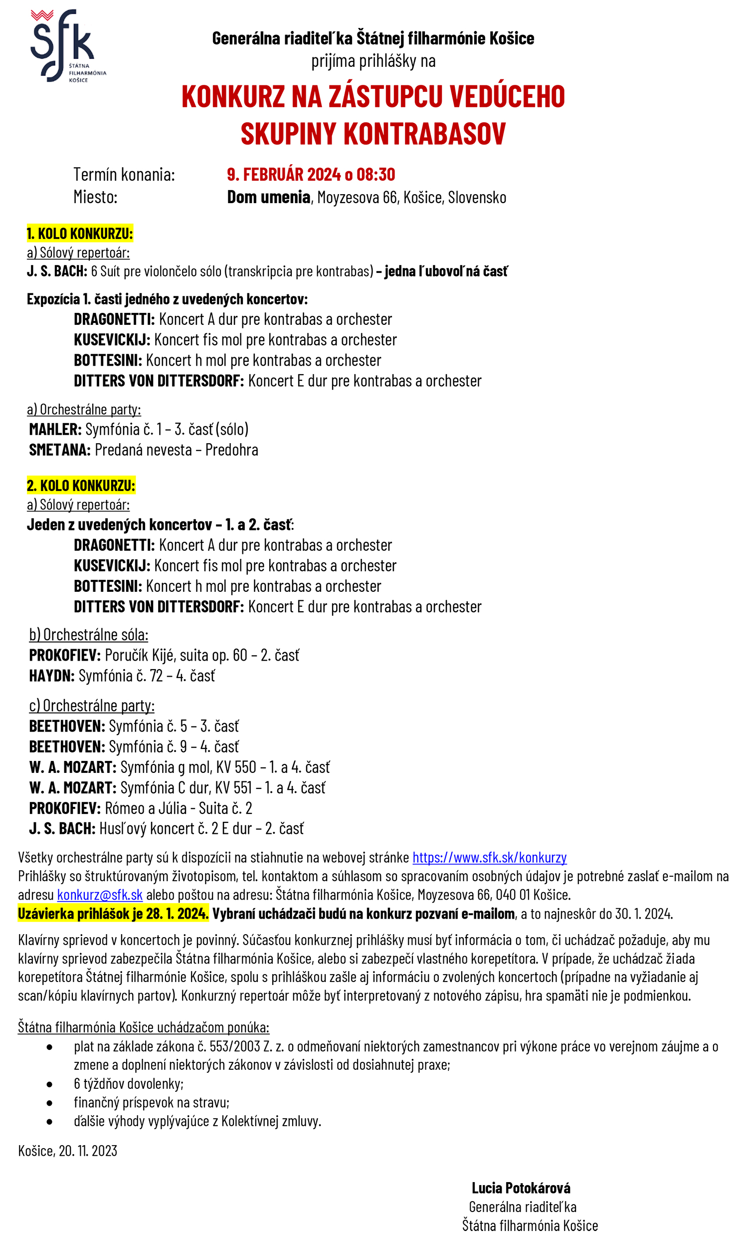 Státní filharmonie Košice přijme zástupce vedoucího skupiny kontrabasů