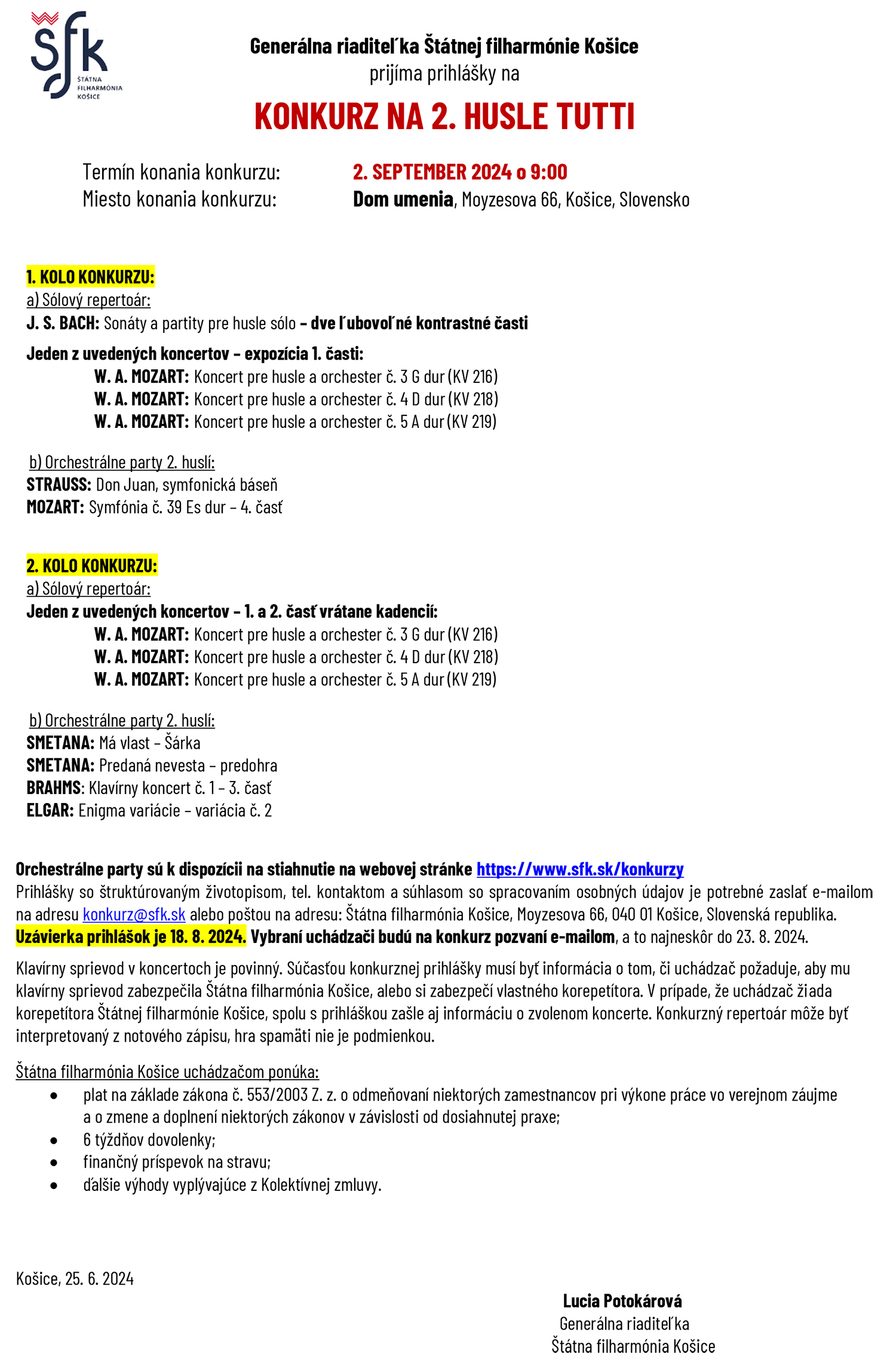 Inzerce Státní filharmonie Košice vypisuje konkurz na 2. housle tutti Publikováno 12/08/2024 sdílejte: 0 minut čtení sdílejte: TémataSeznam inzerátů Sdílet článek Facebook email zkopíruj odkaz vytisknout sdílejte: Předchozí článek Týden s hudbou: Koncerty, opery, TV a streamy (33) Další článek ZUŠ Lovosice přijme učitele hry na klavír 0 0 hlasy Ohodnoťte článek Odebírat Přihlášení Upozornit na nové a další komentáře nové odpovědi na můj komentář Label {} [+] Jméno* E-mail* Webová stránka Label {} [+] Jméno* E-mail* Webová stránka 0 Komentáře Nejstarší Nejnovější Most Voted Inline Feedbacks Zobrazit všechny komentáře Načíst další
