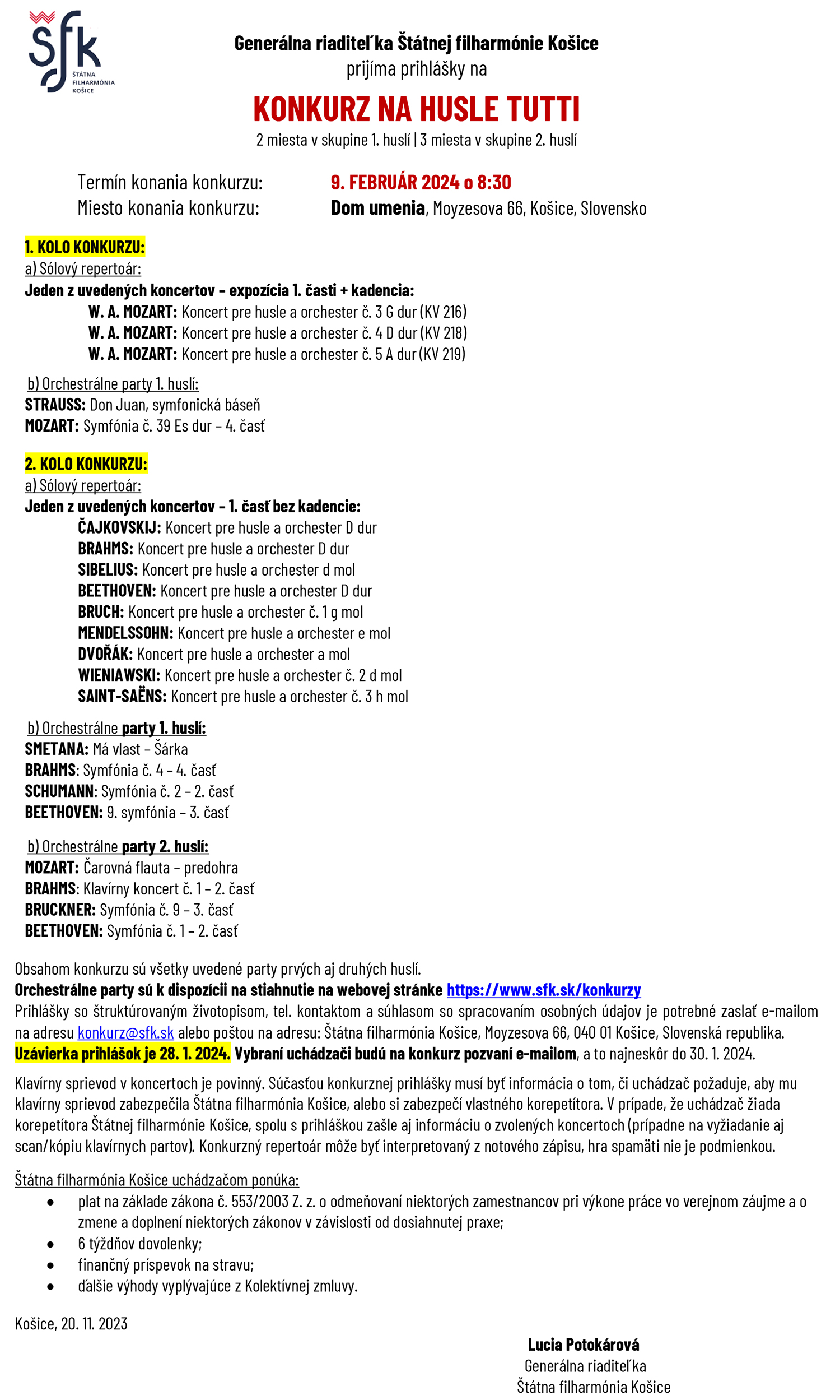 Inzerce Státní filharmonie Košice vypisuje konkurz na Housle tutti Publikováno 30/11/2023 sdílejte: 0 minut čtení sdílejte: TémataSeznam inzerátů Sdílet článek Facebook email zkopíruj odkaz vytisknout sdílejte: Předchozí článek Skladatel Šimon Voseček: Pokud umění nemá publikum, není to umění Další článek Čajkovský a jeho démon v pojetí Anny Vity – sugestivní zápas lidského nitra 0 0 hlasy Ohodnoťte článek Odebírat Přihlášení Upozornit na nové a další komentáře nové odpovědi na můj komentář Label {} [+] Jméno* E-mail* Webová stránka Label {} [+] Jméno* E-mail* Webová stránka 0 Komentáře Nejstarší Nejnovější Most Voted Inline Feedbacks Zobrazit všechny komentáře Načíst další