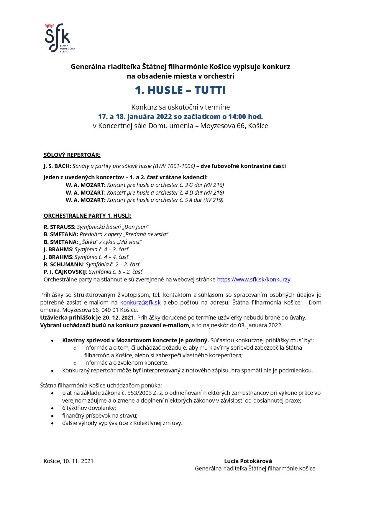 Inzerce Státní filharmonie Košice vypisuje konkurz na obsazení pozice 1. houslí – tutti Publikováno 01/12/2021 sdílejte: 0 minut čtení sdílejte: Party ke stáhnutí zde. TémataSeznam inzerátů Sdílet článek Facebook email zkopíruj odkaz vytisknout sdílejte: Předchozí článek Seznamte se: Tereza Horáková Další článek Mezinárodní hudební festival Leoše Janáčka zahájil vánoční předprodej 0 0 hlasy Ohodnoťte článek Odebírat Přihlášení Upozornit na nové a další komentáře nové odpovědi na můj komentář Label {} [+] Jméno* E-mail* Webová stránka Label {} [+] Jméno* E-mail* Webová stránka 0 Komentáře Nejstarší Nejnovější Most Voted Inline Feedbacks Zobrazit všechny komentáře Načíst další